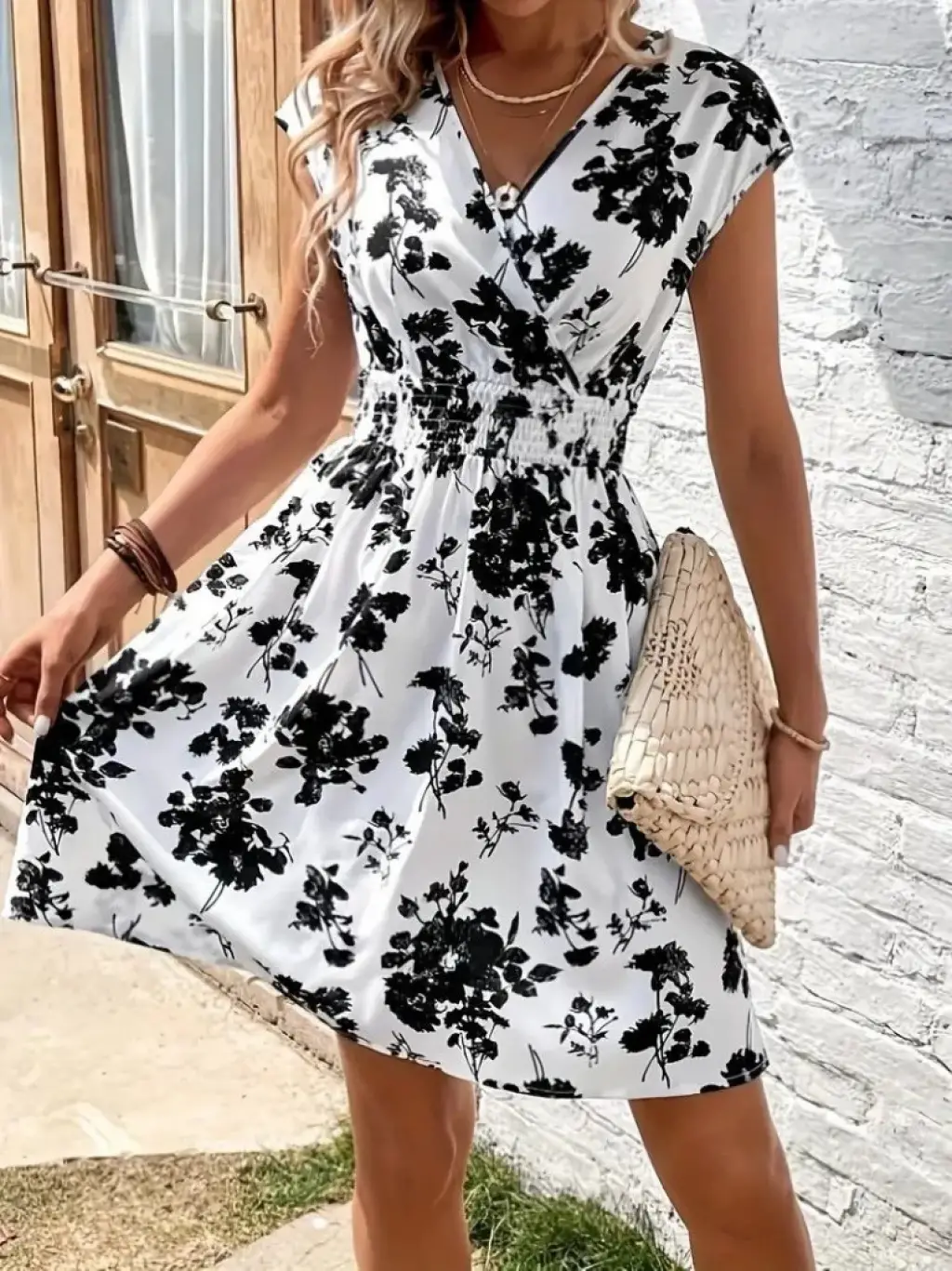 Omarı Çiçek Desenli Kısa Kollu Elbise