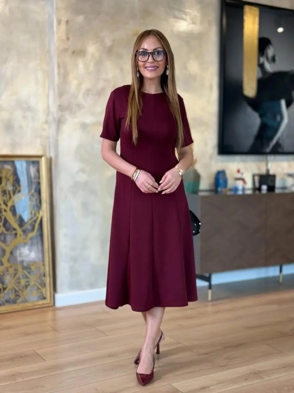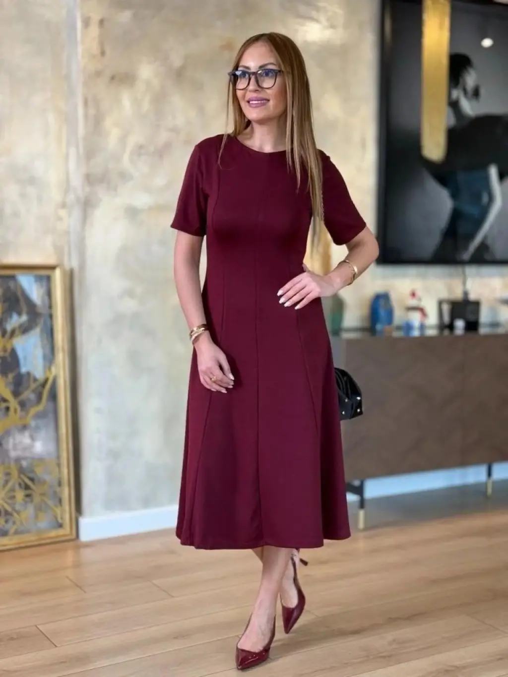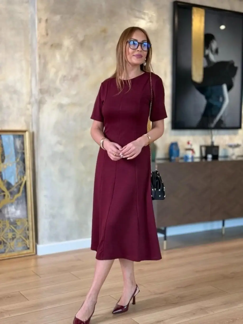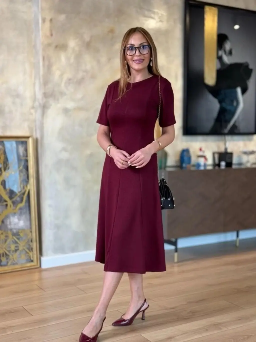 Kadın Kısa Kollu Bisiklet Yaka Midi Viskon Iki Iplik Elbise