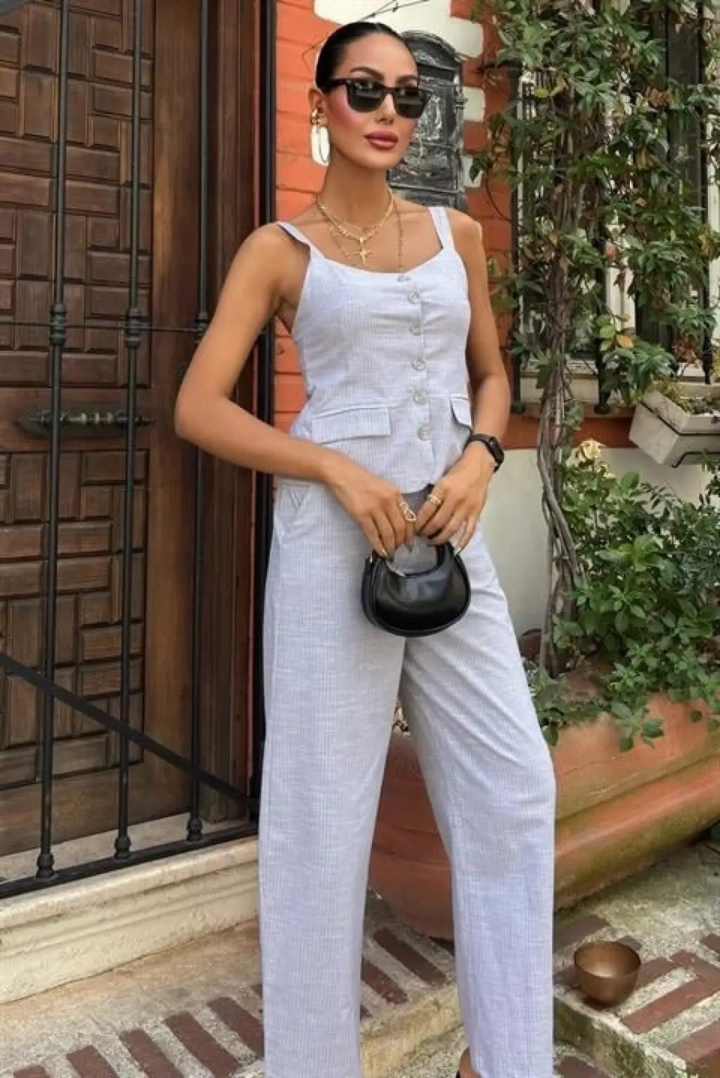 Kalın Askılı Bluz Pantolon Keten Takım 10187