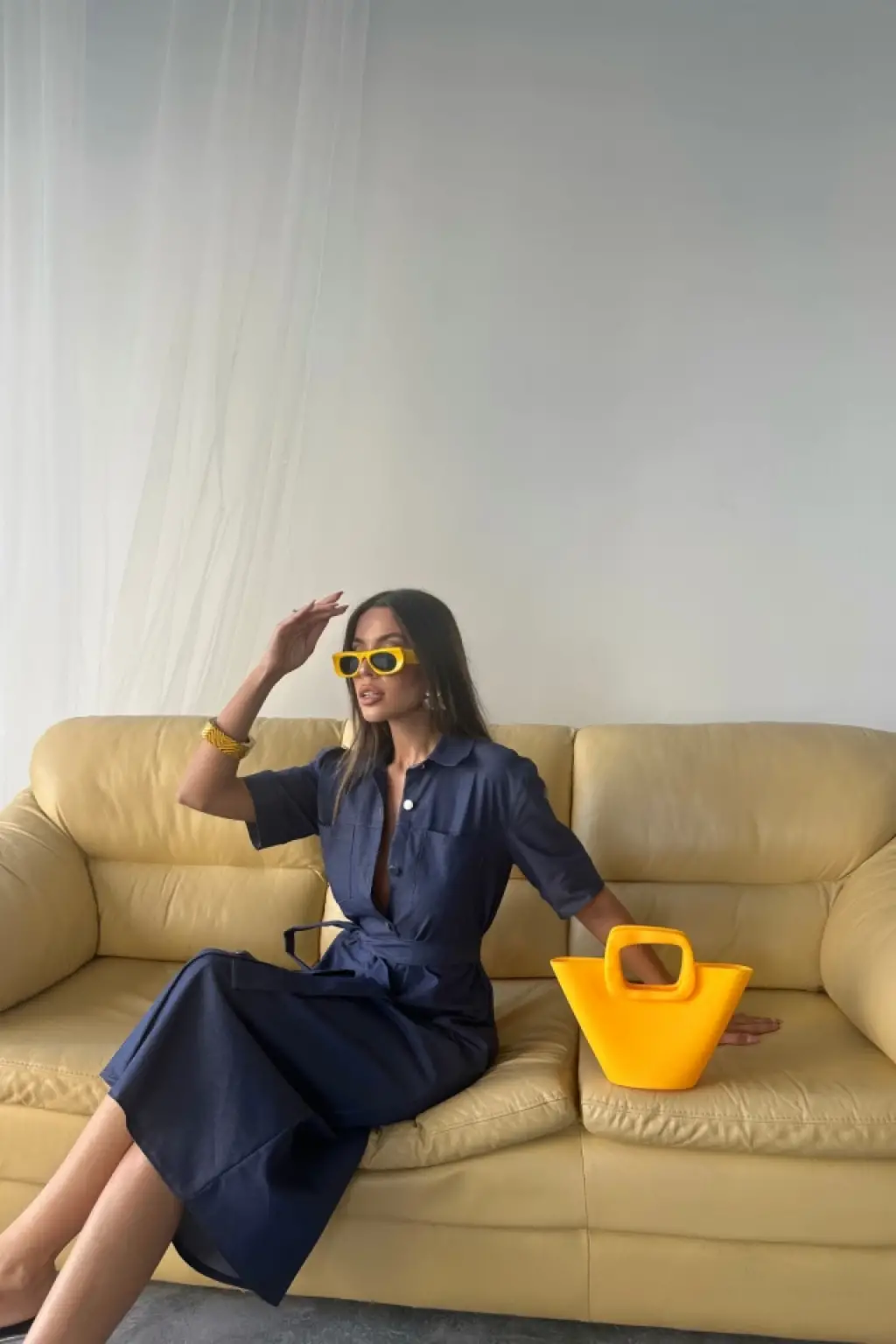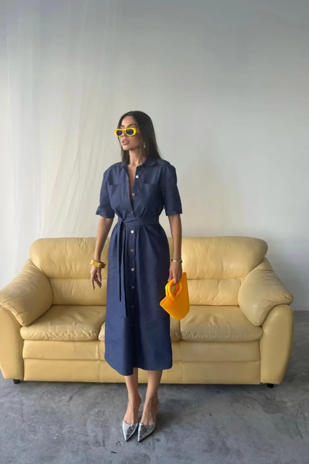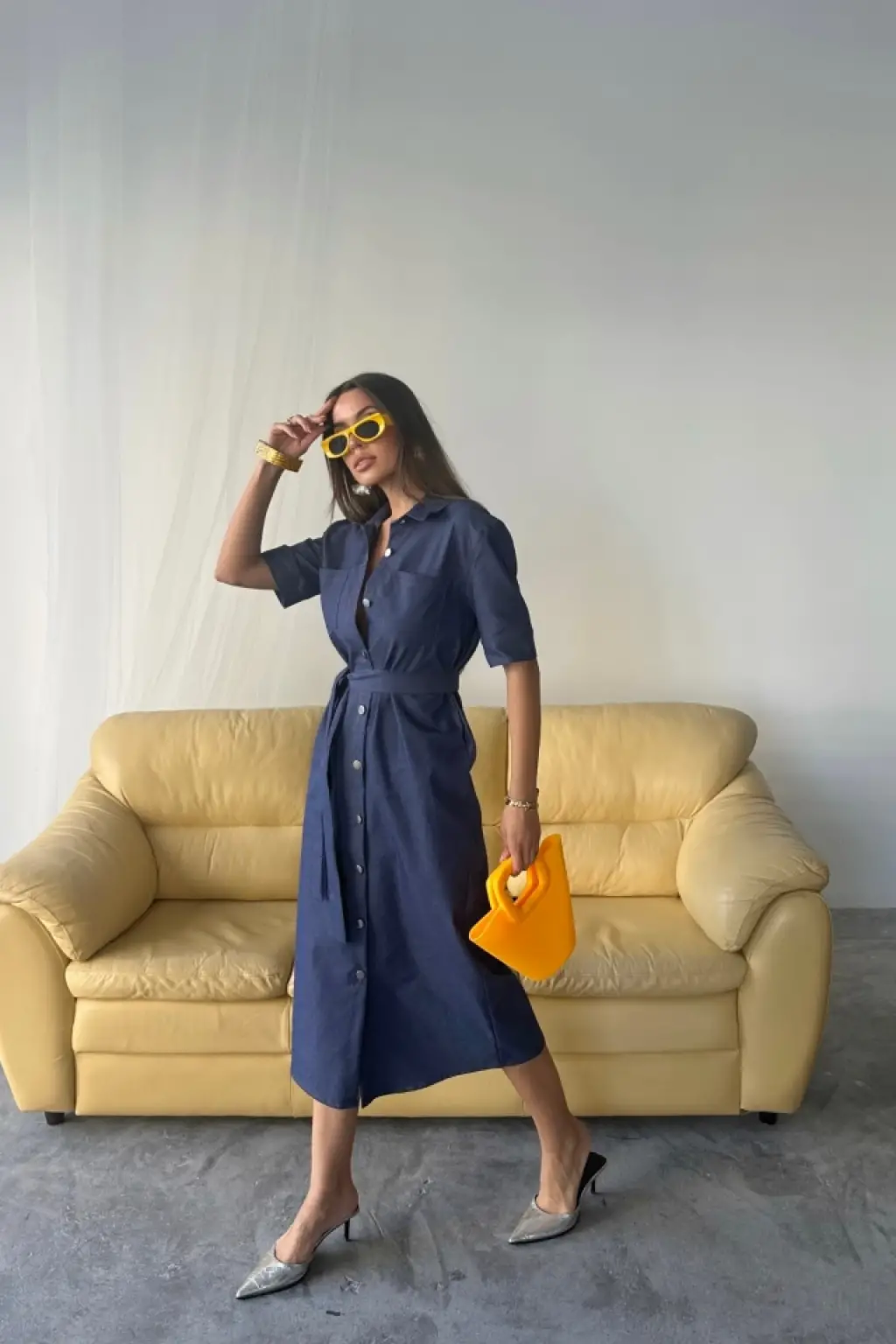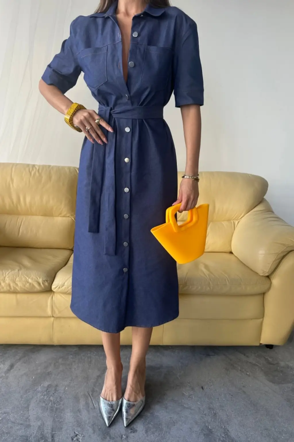Benorra ÖNDEN DÜĞMELİ KISA KOL ELBİSE - Mavi