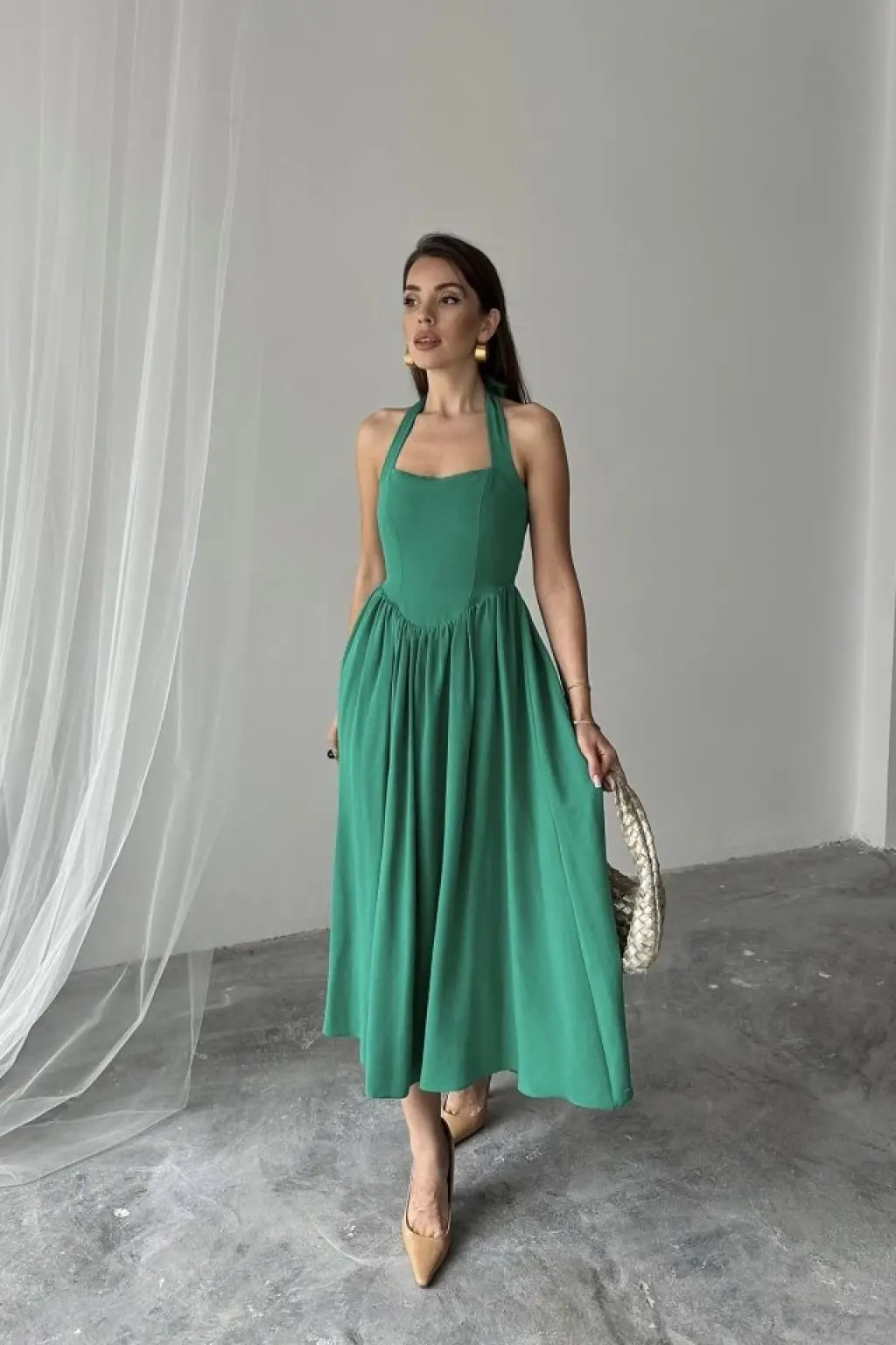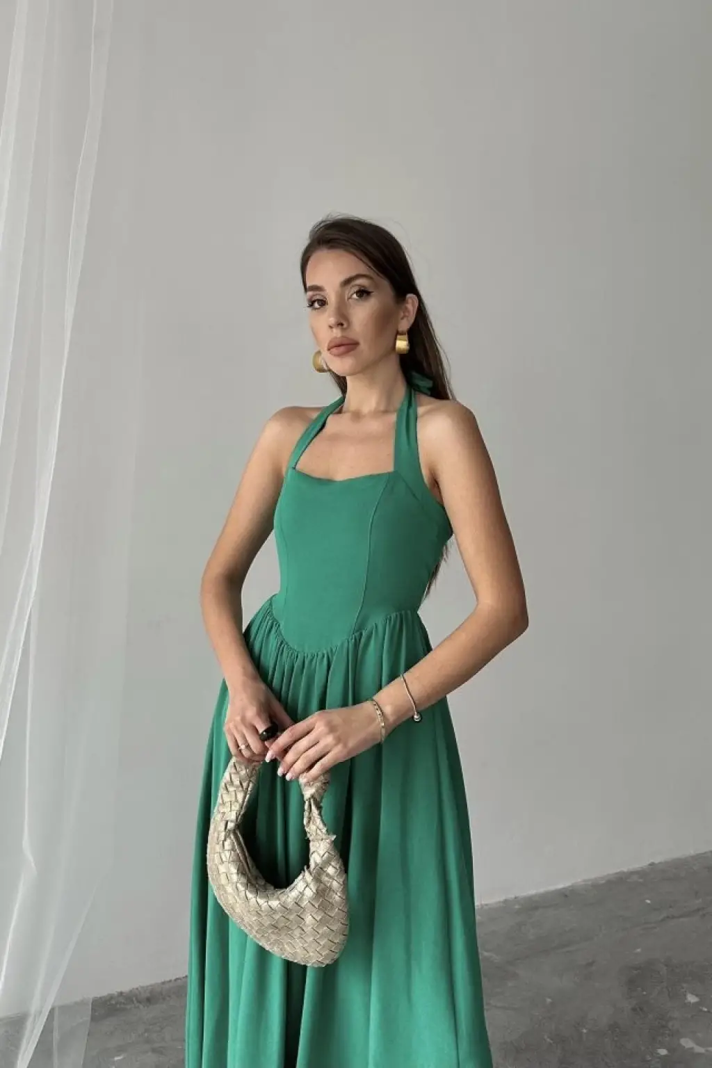 Yeşil Boyundan Bağlamalı Keten Elbise