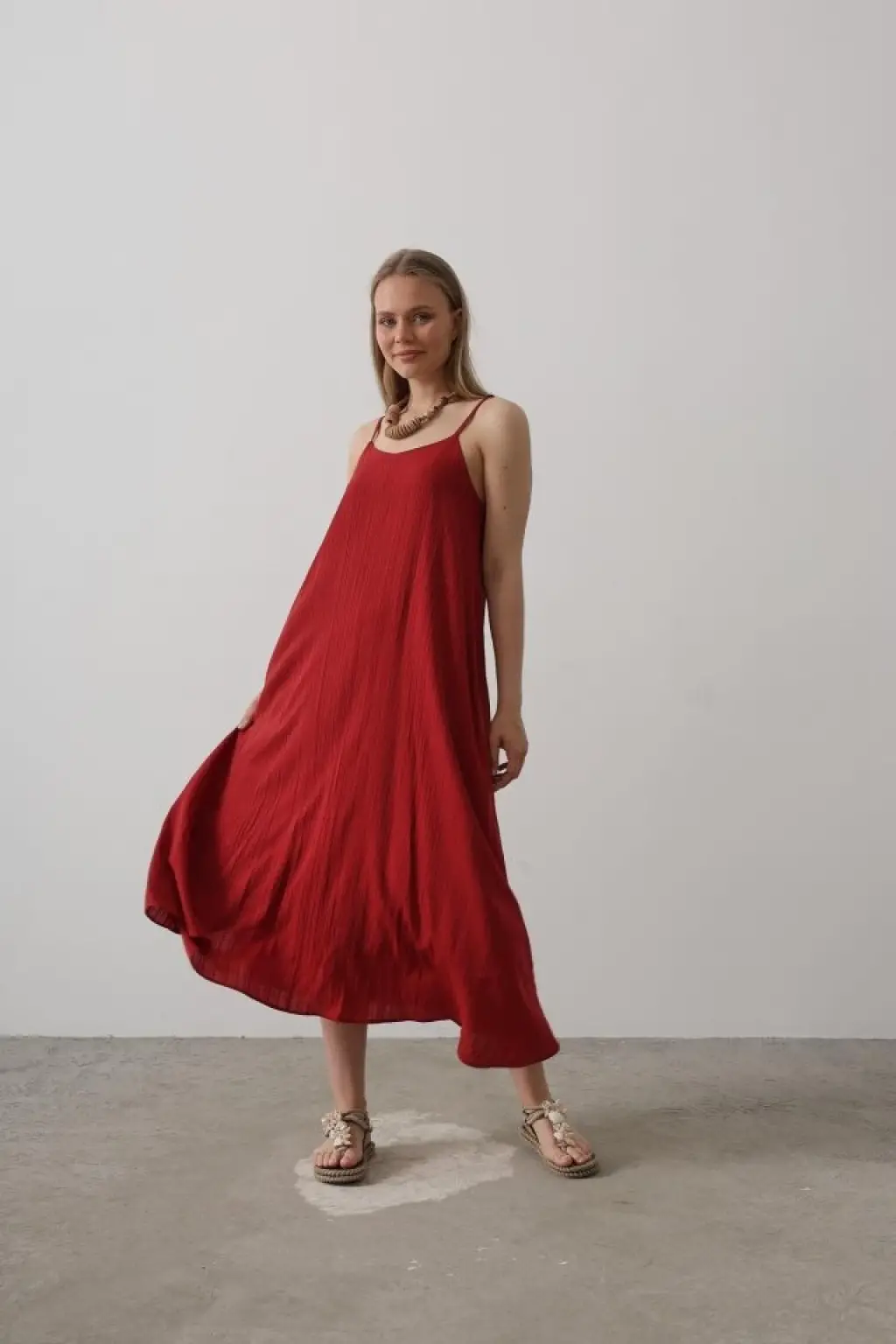 Kadın Ip Askılı Yuvarlak Yakalı Cepli Uzun Viskon Elbise