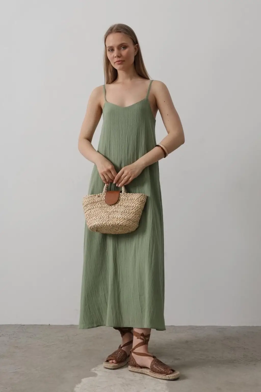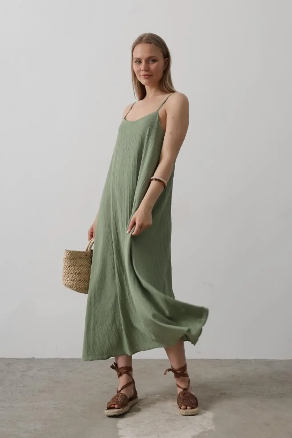 Askılı Uzun Çan Elbise - Haki