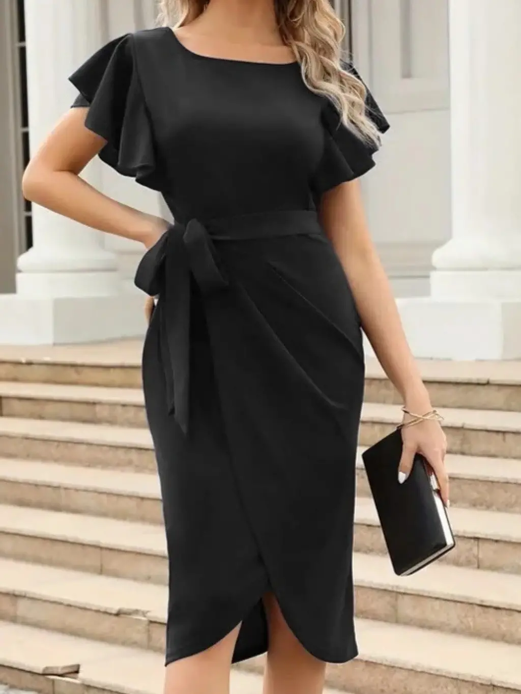 Kadın Kısa Fırfır Kollu Yakası Açık Belden Kuşaklı çapraz Kesim Detaylı Ithal Krep Elbise