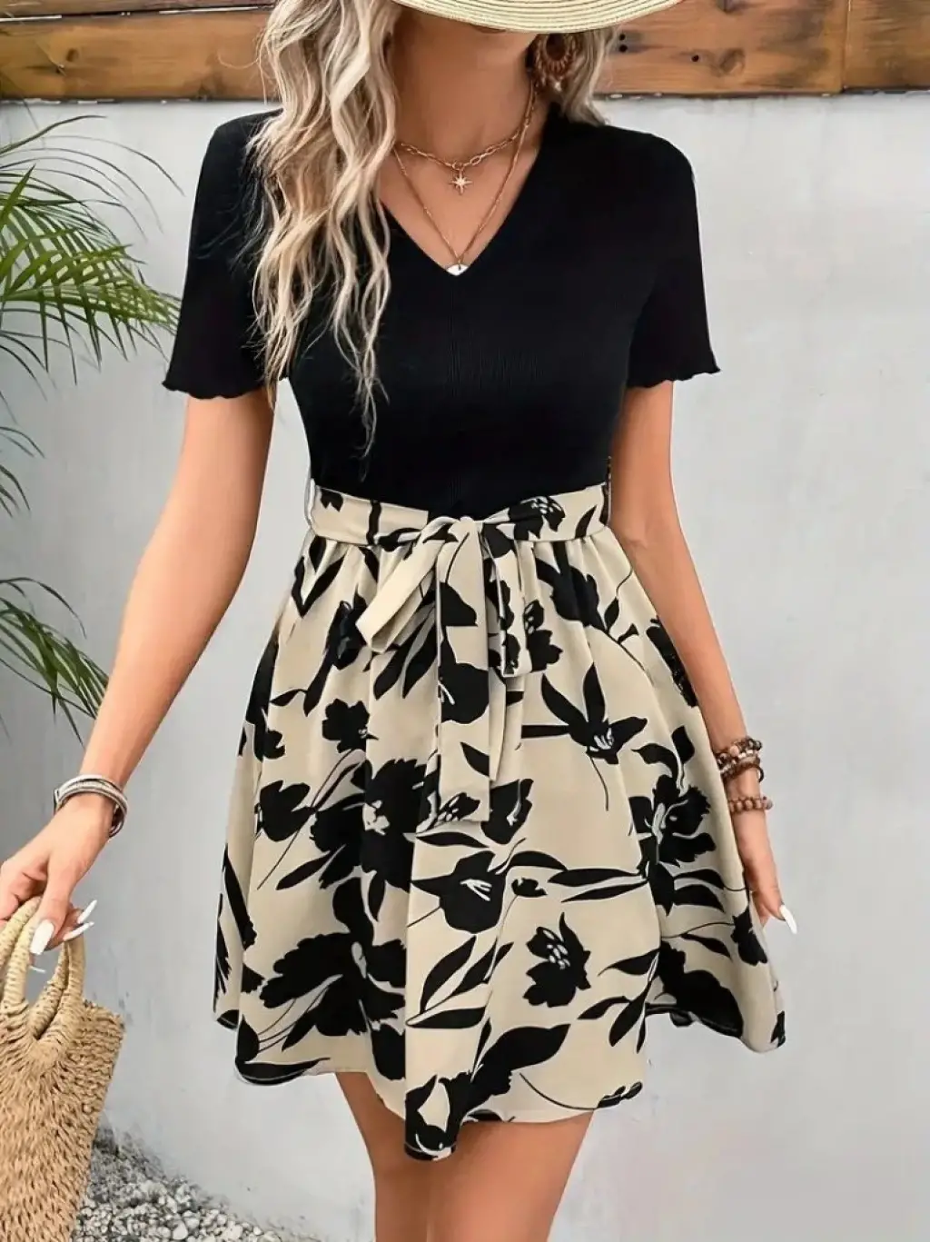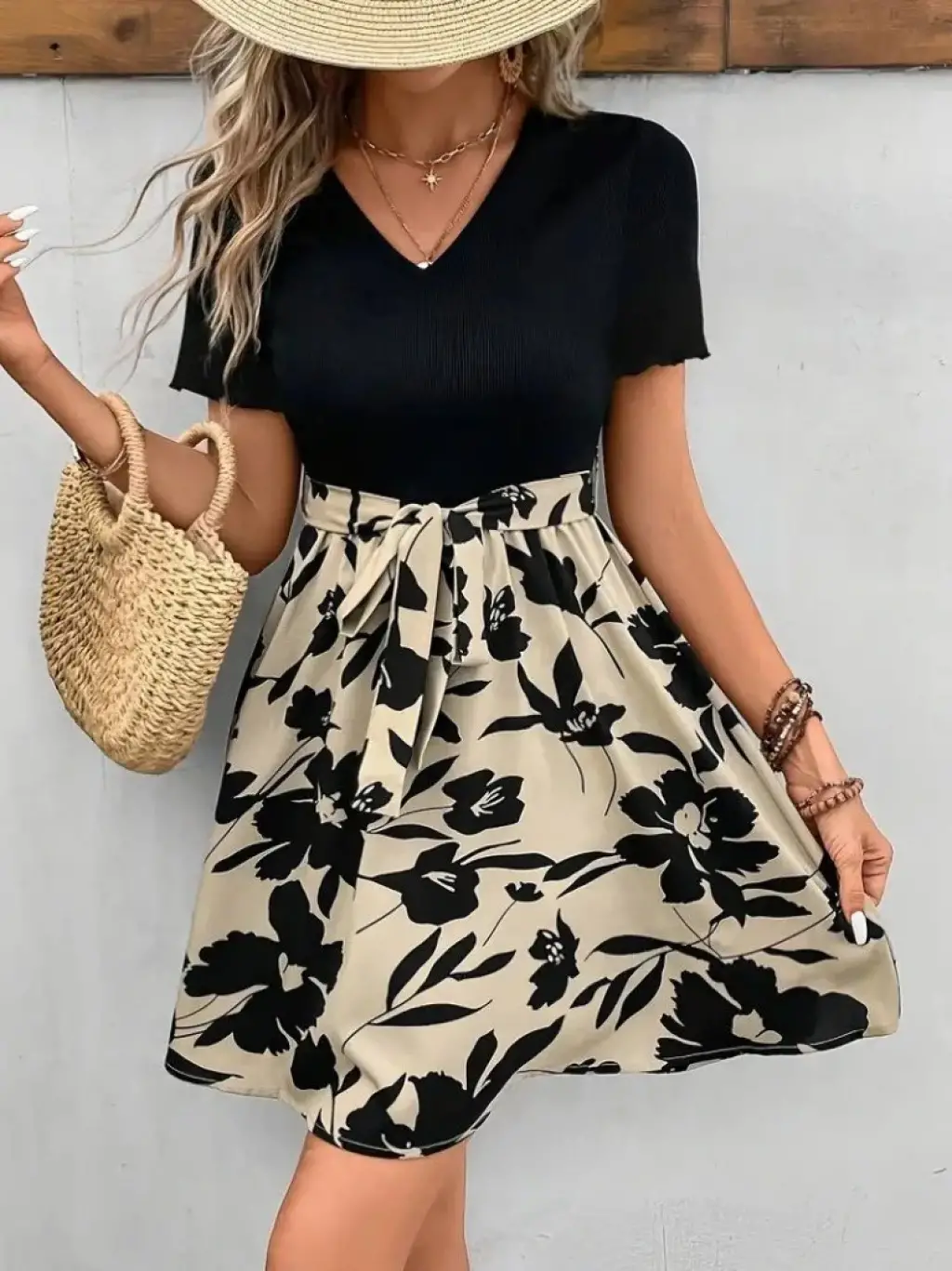 Kadın Kısa Kollu V Yakalı Belden Kuşaklı çiçek Desenli üst Viskon Alt Süprem Elbise