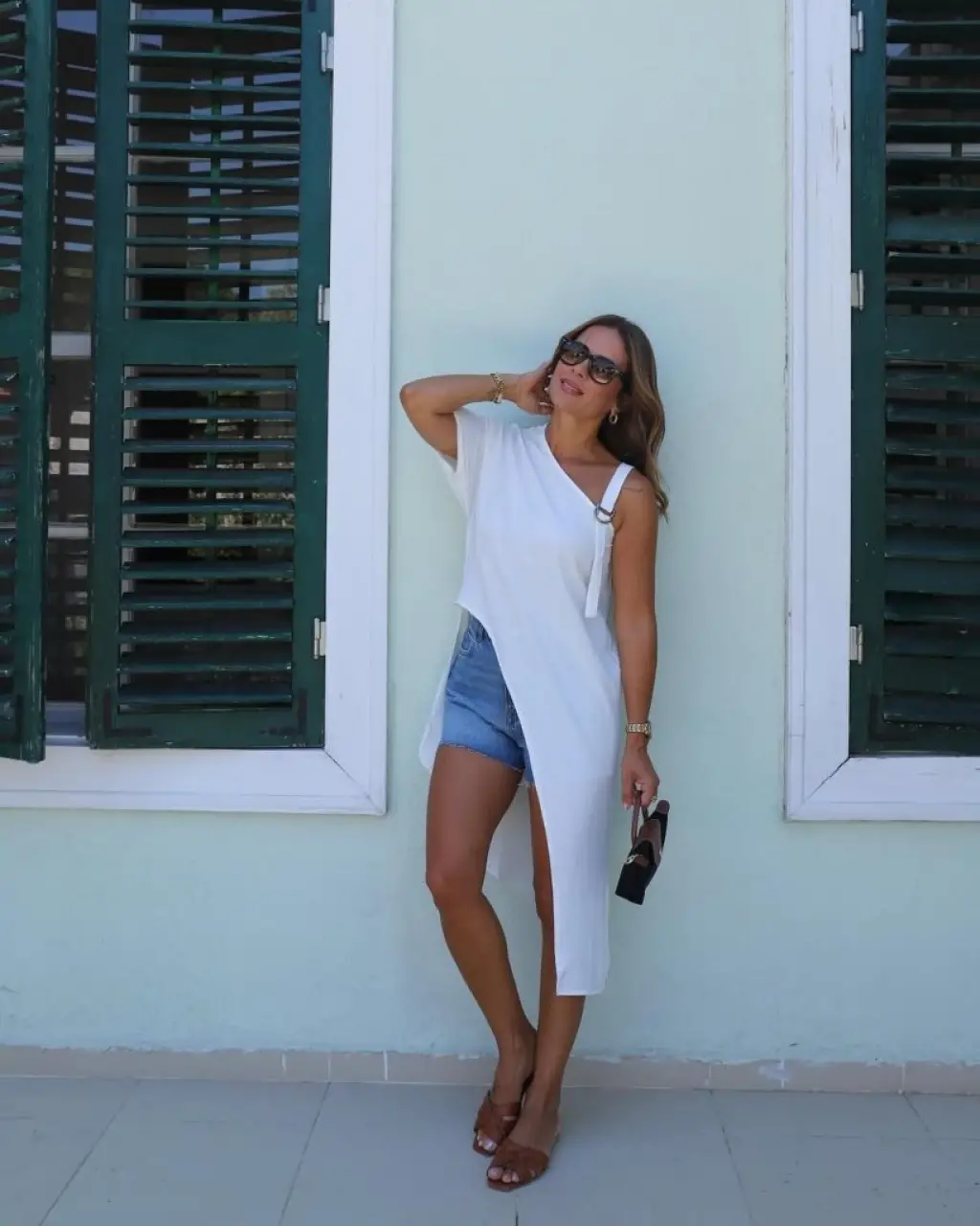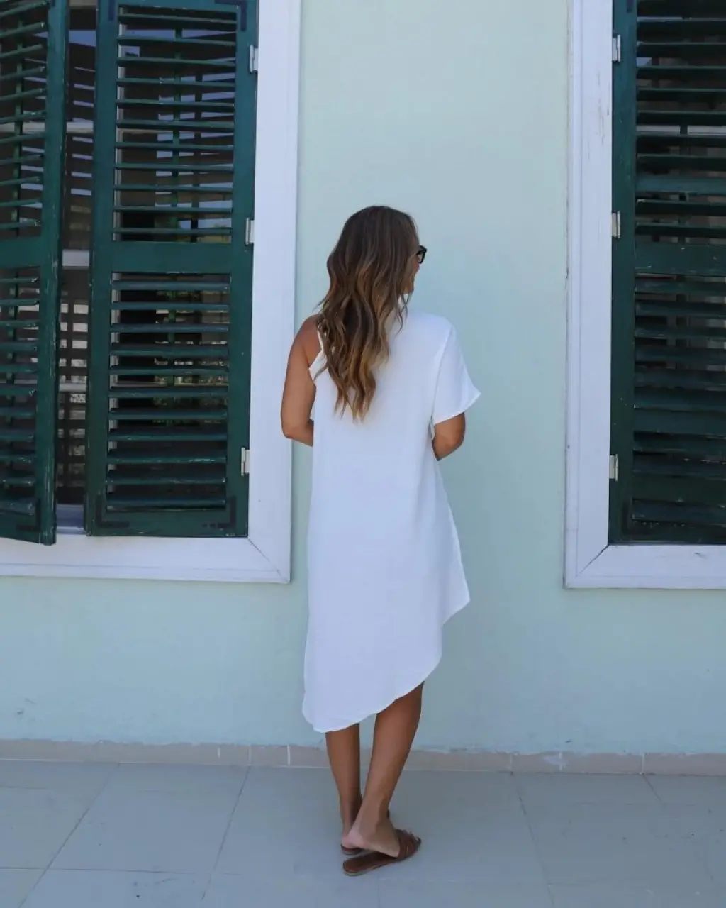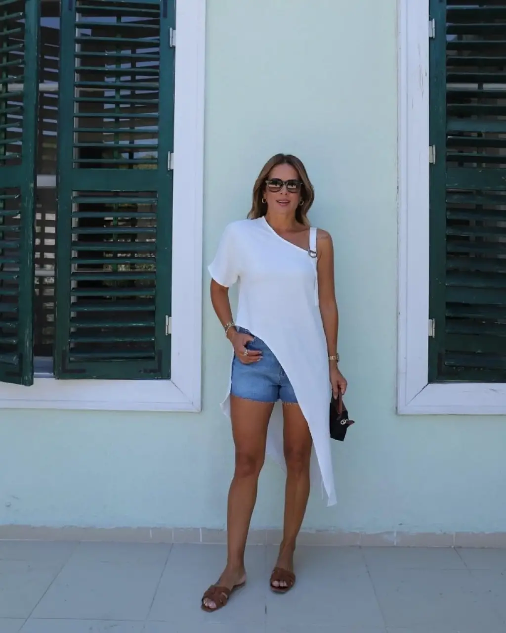 Kadın Tek Omuzu Açık Kısa Kollu Salaş Viskon Bluz