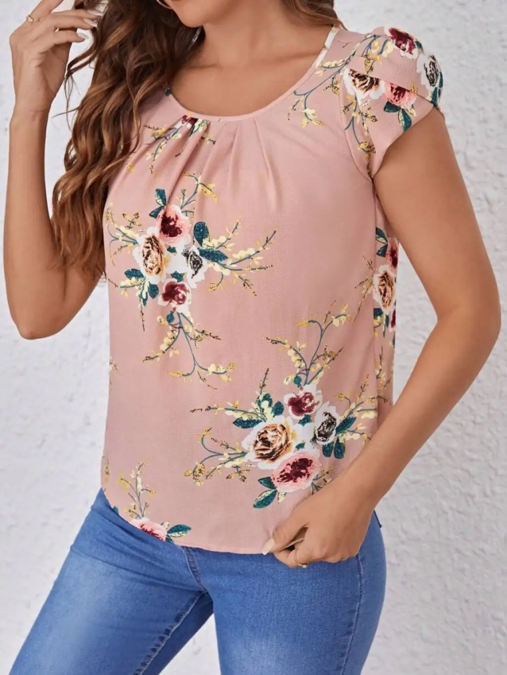 Kadın Kısa Kollu Bisiklet Yaka çiçek Baskılı Süprem Bluz