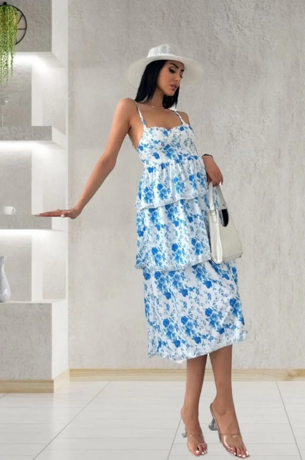Omarı Dekolteli Çiçek Baskılı Midi Elbise
