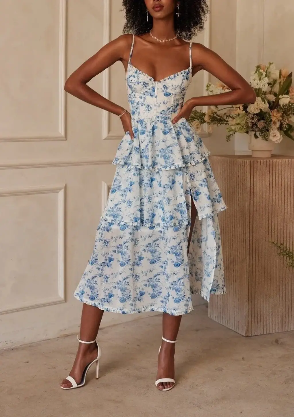 Kadın Sıfır Kol Askılı Dekolteli Yırtmaç Detay çiçek Baskılı Süprem Midi Elbise