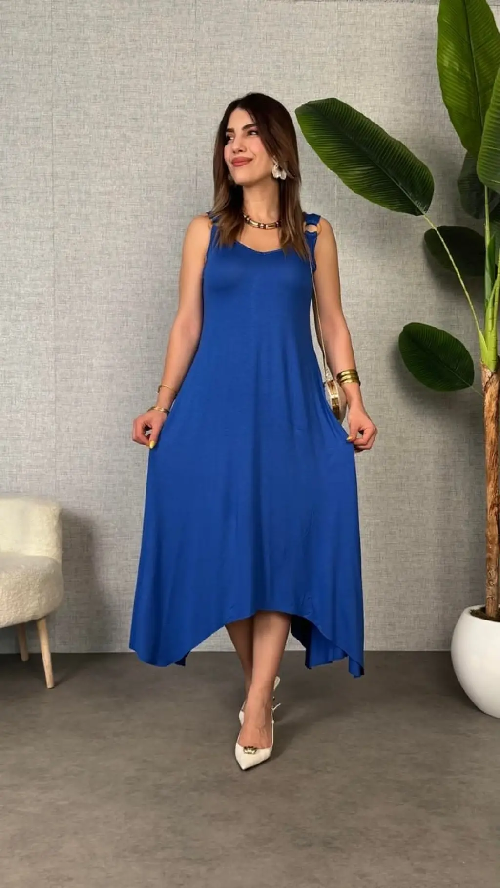 Kadın Ip Askılı Yuvarlak Yakalı Cepli Uzun Viskon Elbise
