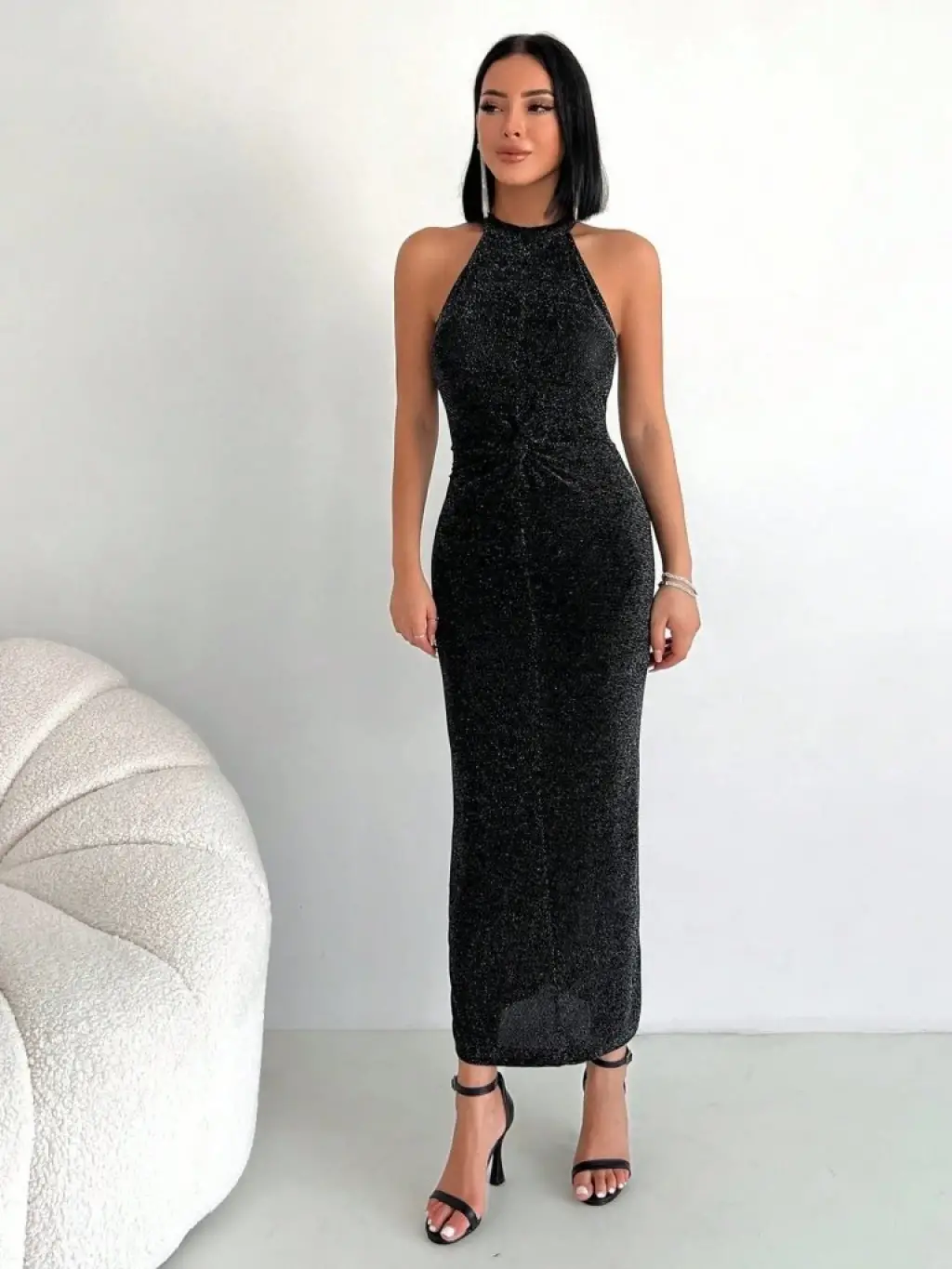Kadın Uzun Kollu Derin V Kruvaze Yaka Beli Lastik Yırtmaç Ve Bağcık Detaylı Sandy Tam Boy Elbise