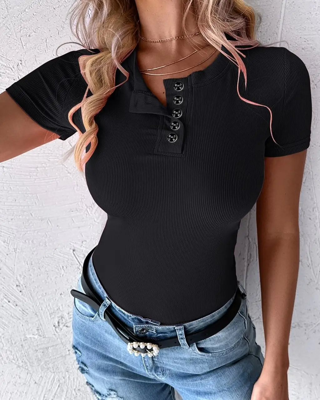 Kadın Kısa Kollu Yuvarlak Yakalı Düğme Detay Kaşkorse Bluz