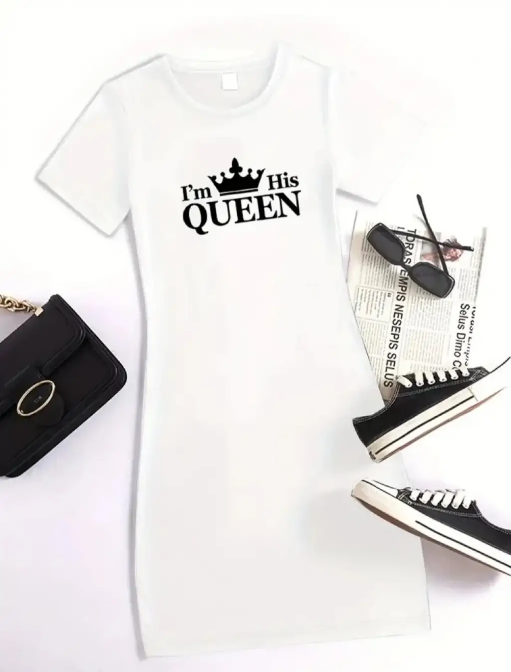 Kadın Kısa Kollu Queen Baskı Iki Iplik Mini Elbise