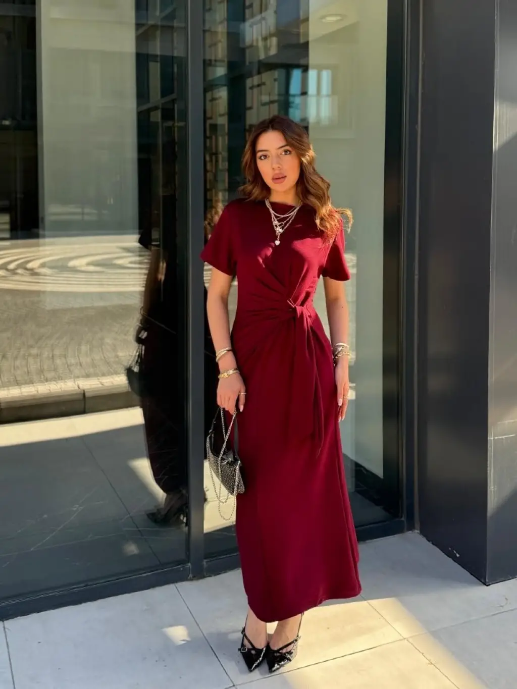 Kadın Kısa Kollu Bisiklet Yaka Yandan Bağlamalı Viskon Iki Iplik Elbise
