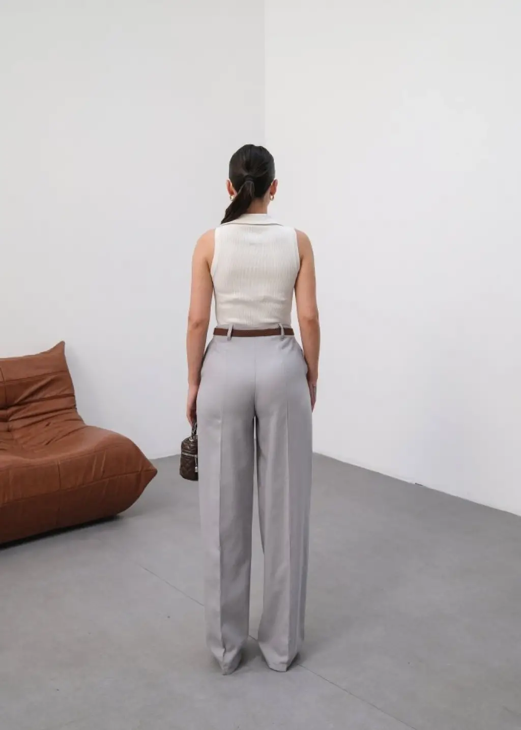 Kadın Yüksek Bel Geniş Paça Detaylı Cepli Ithal Krep Pantolon