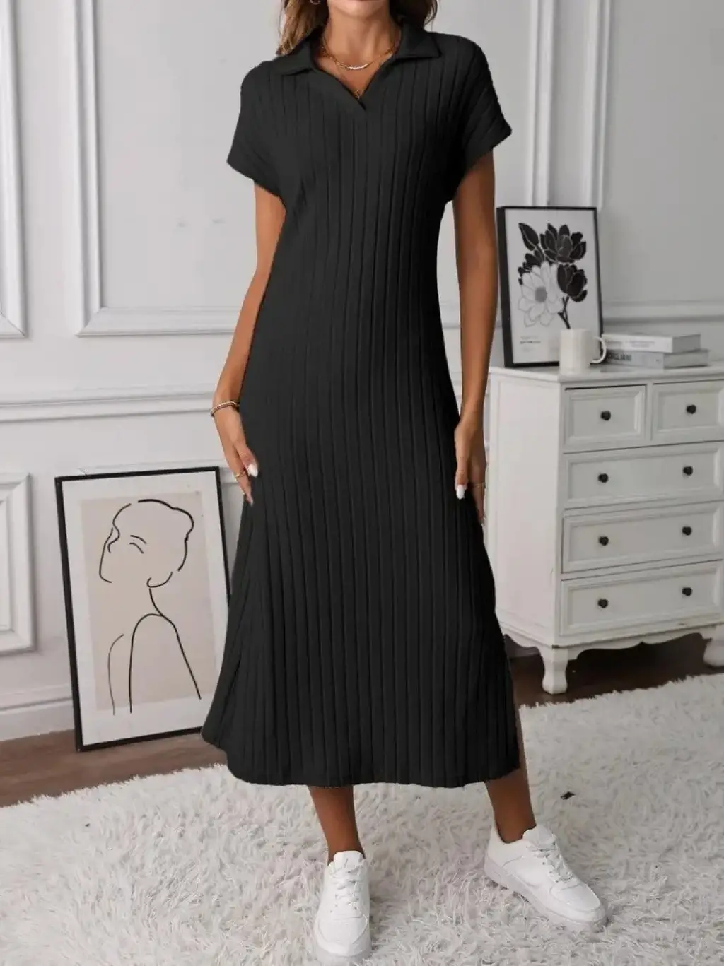 Kadın Kısa Kollu Yakalı Yandan Yırtmaçlı Kalın Fitilli Kaşkorse Elbise