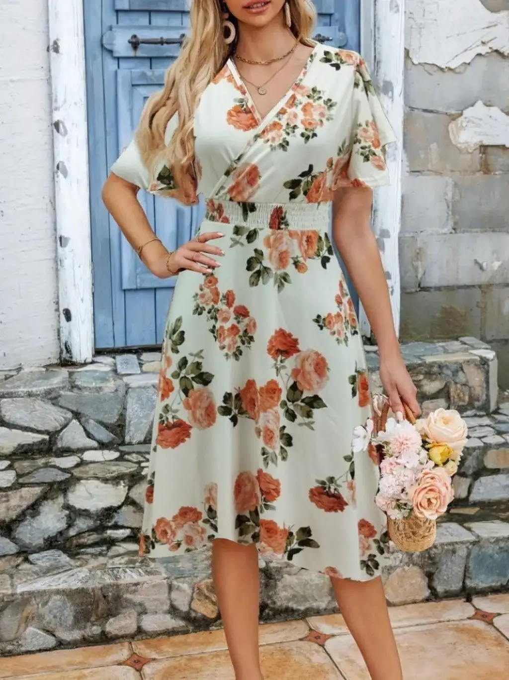 Kadın Kısa Kollu Kruvaze Yakalı Desenli Süprem Kısa Elbise