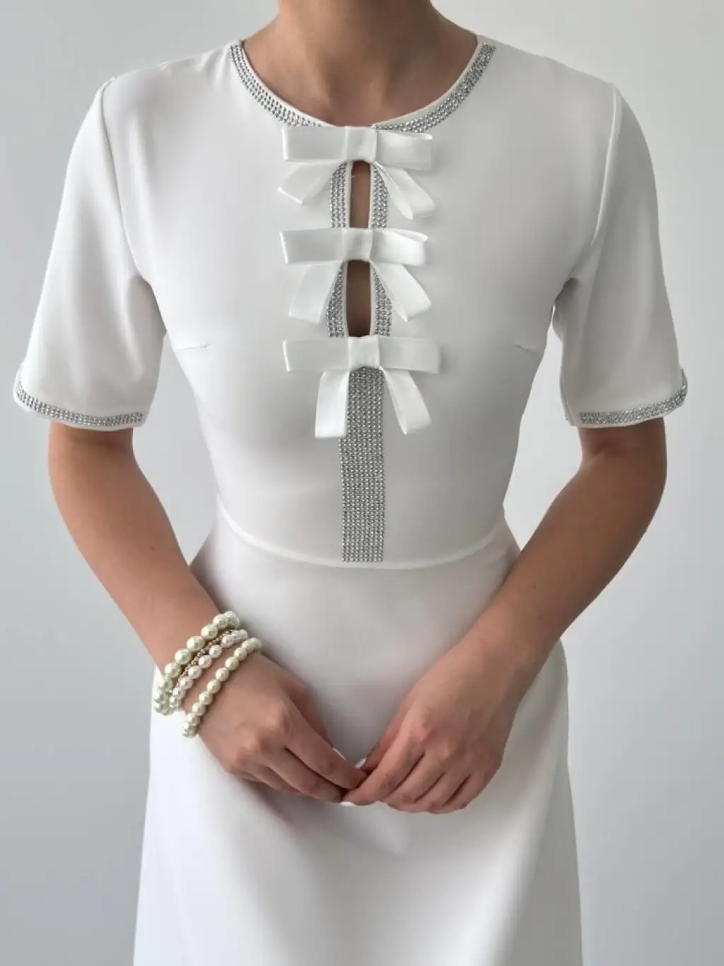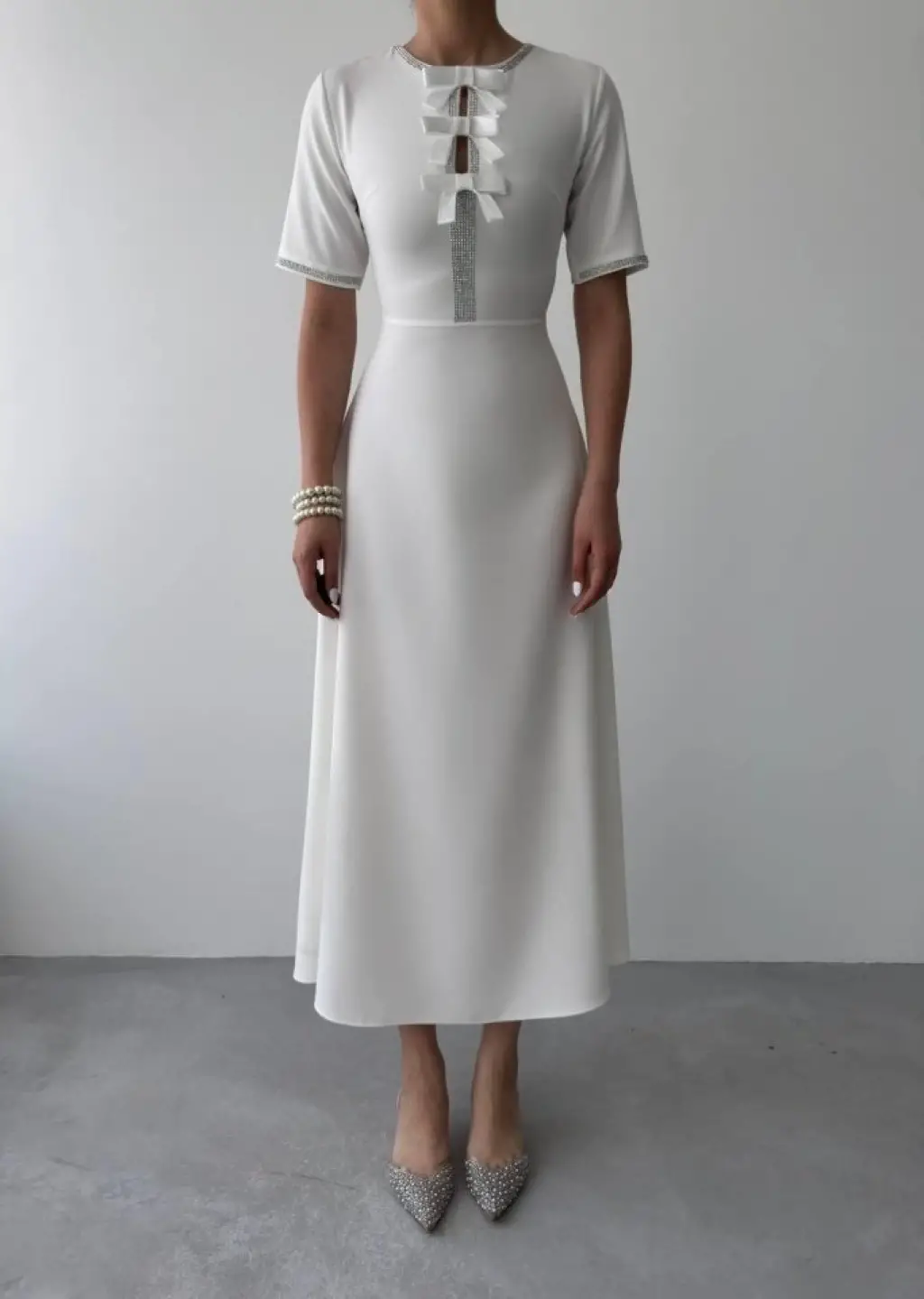 Kadın Kısa Kollu Madonna Yaka önü Kısa Arkası Uzun Ithal Krep Elbise