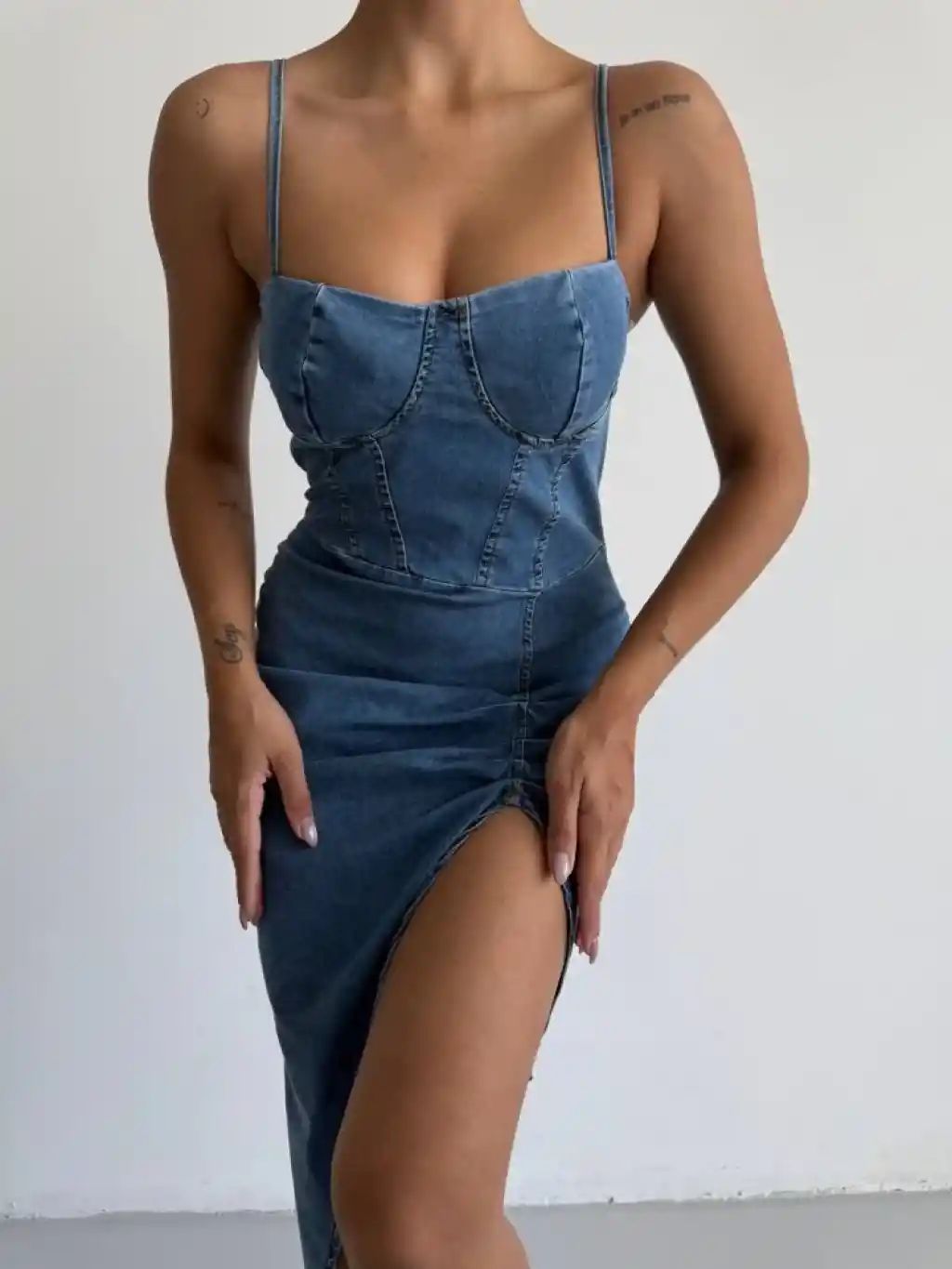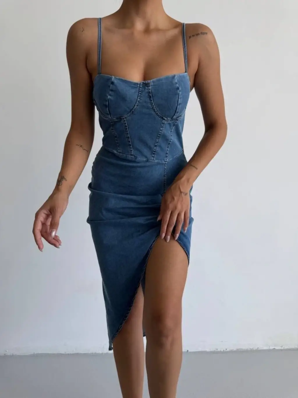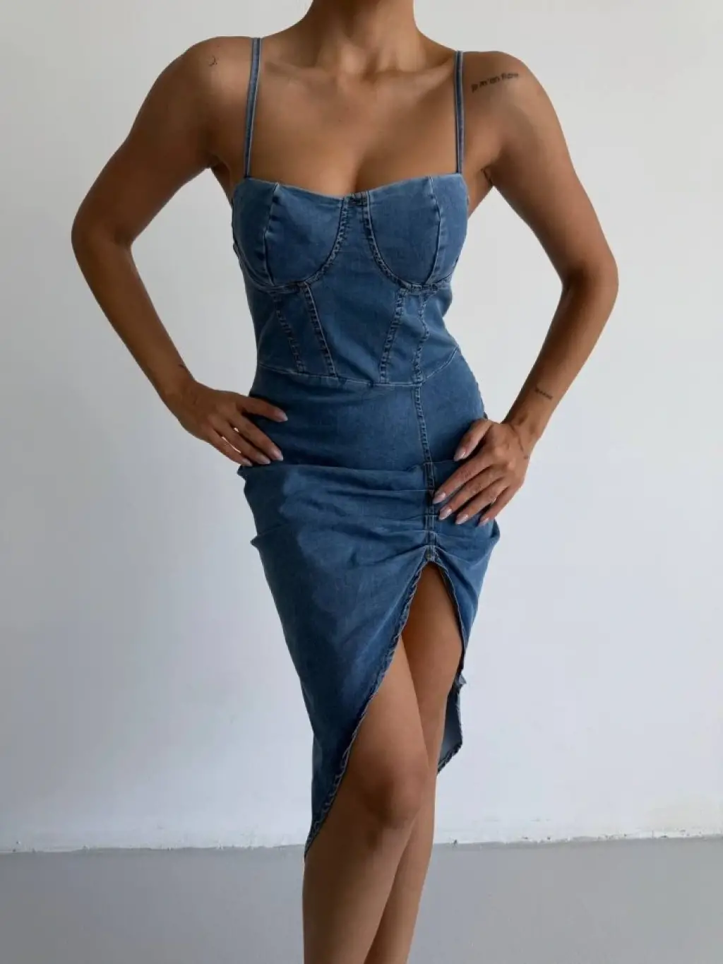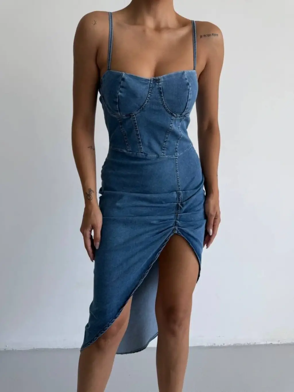 Kadın Omuz Askılı Derin Bacak Dekoltesi Ve Büzgü Detay Kot Elbise