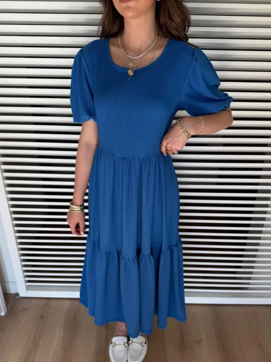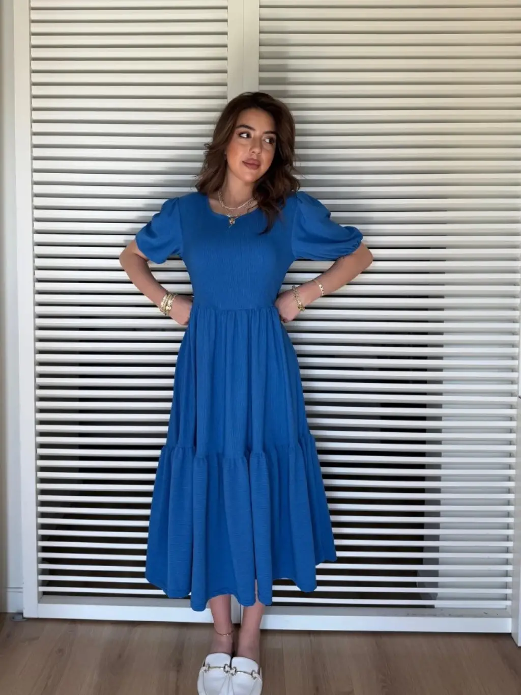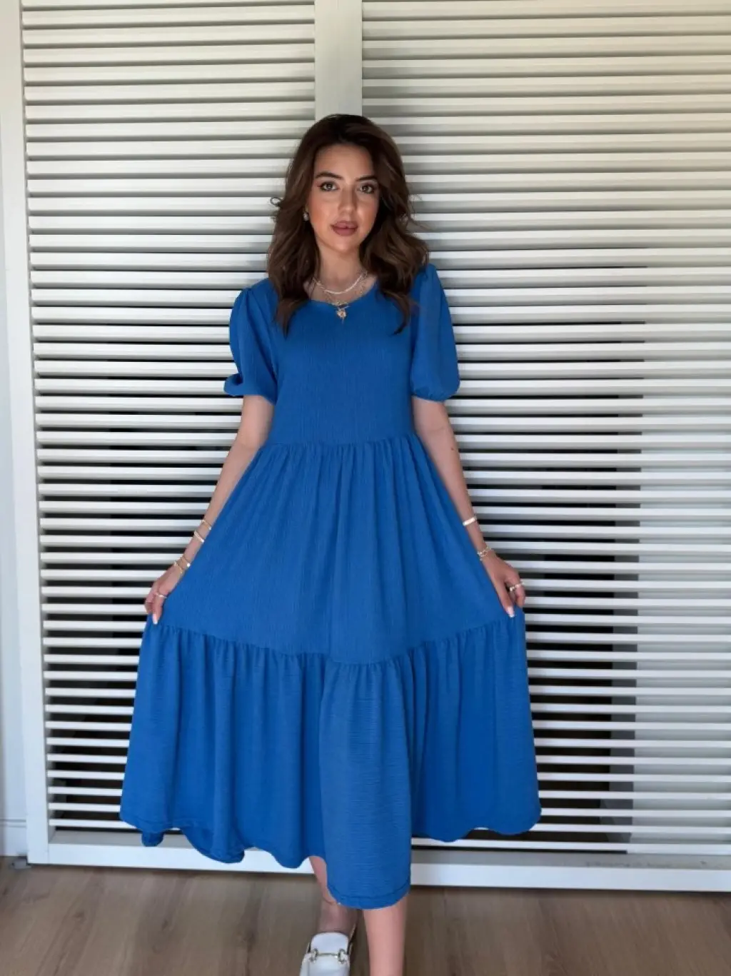 Kadın Kısa Kollu Yakası Açık Katlı Bürümcük Balon Elbise