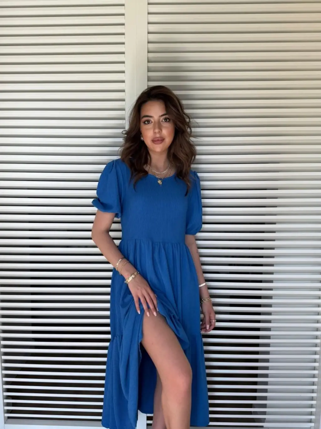 Kadın Truvakar Kollu Bisiklet Yaka Kemersiz Yırtmaç Detaylı Uzun Ithal Krep Elbise