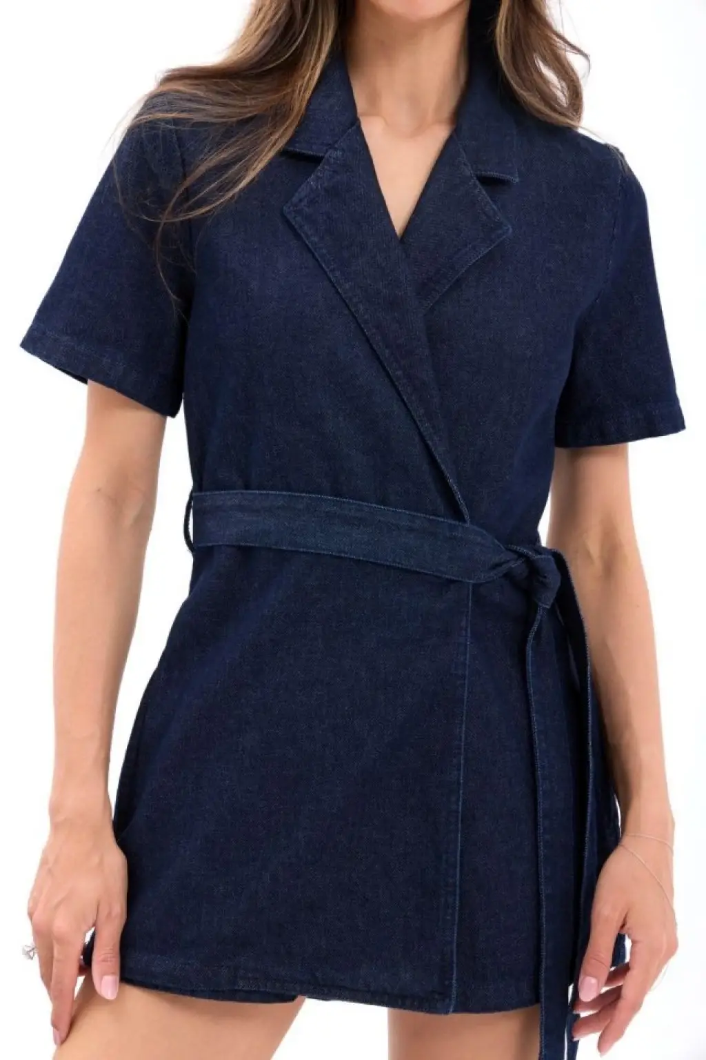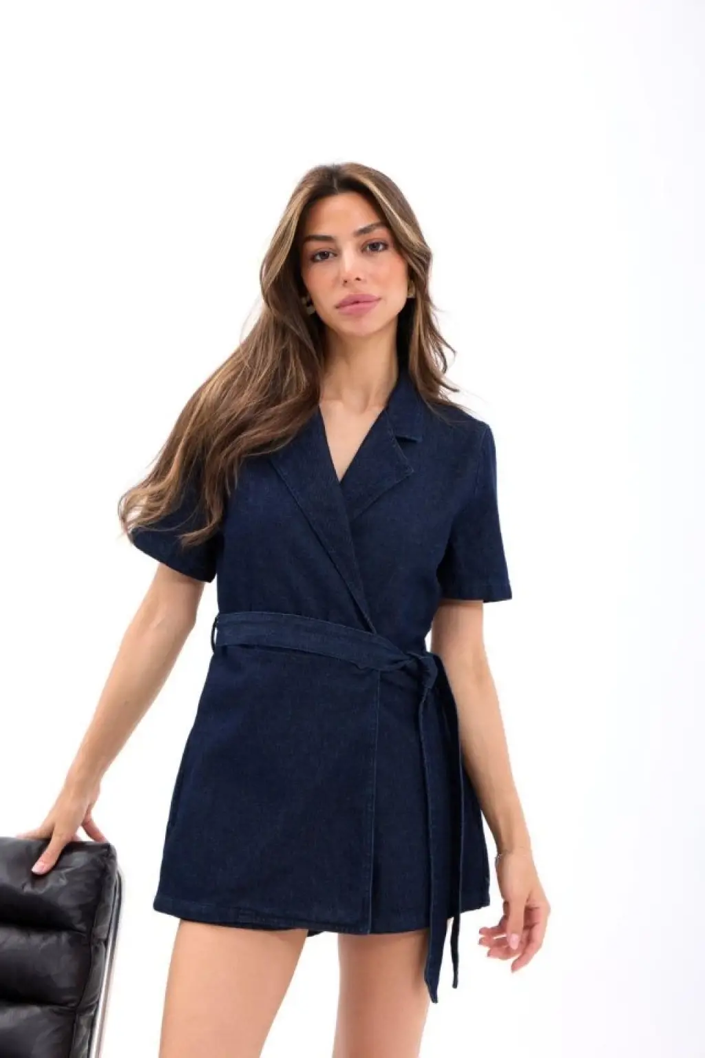 Kadın Kruvaze Yaka Kısa Kollu Kuşaklı Tulum