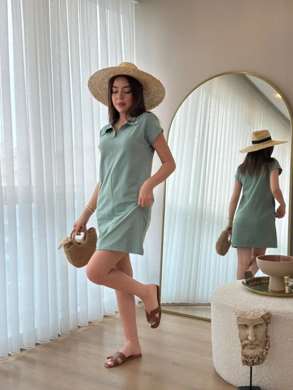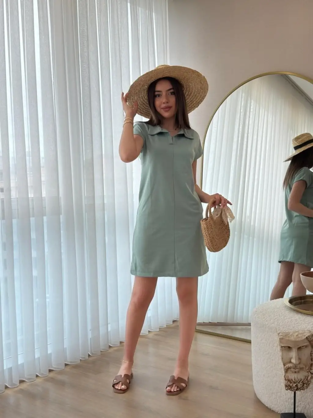 Kadın Kısa Kollu Yakalı Viskon Iki Iplik Elbise