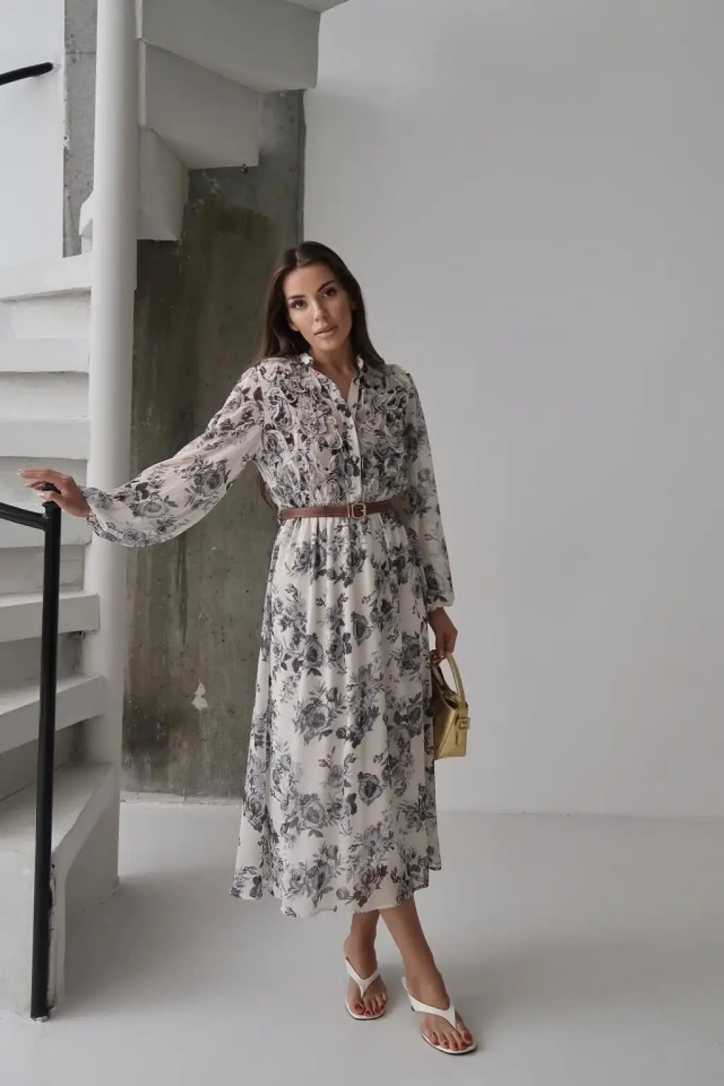 Kadın Uzun Kollu Uakadabağcıklı Beli Lastikli Desenli Uzun Süprem Elbise