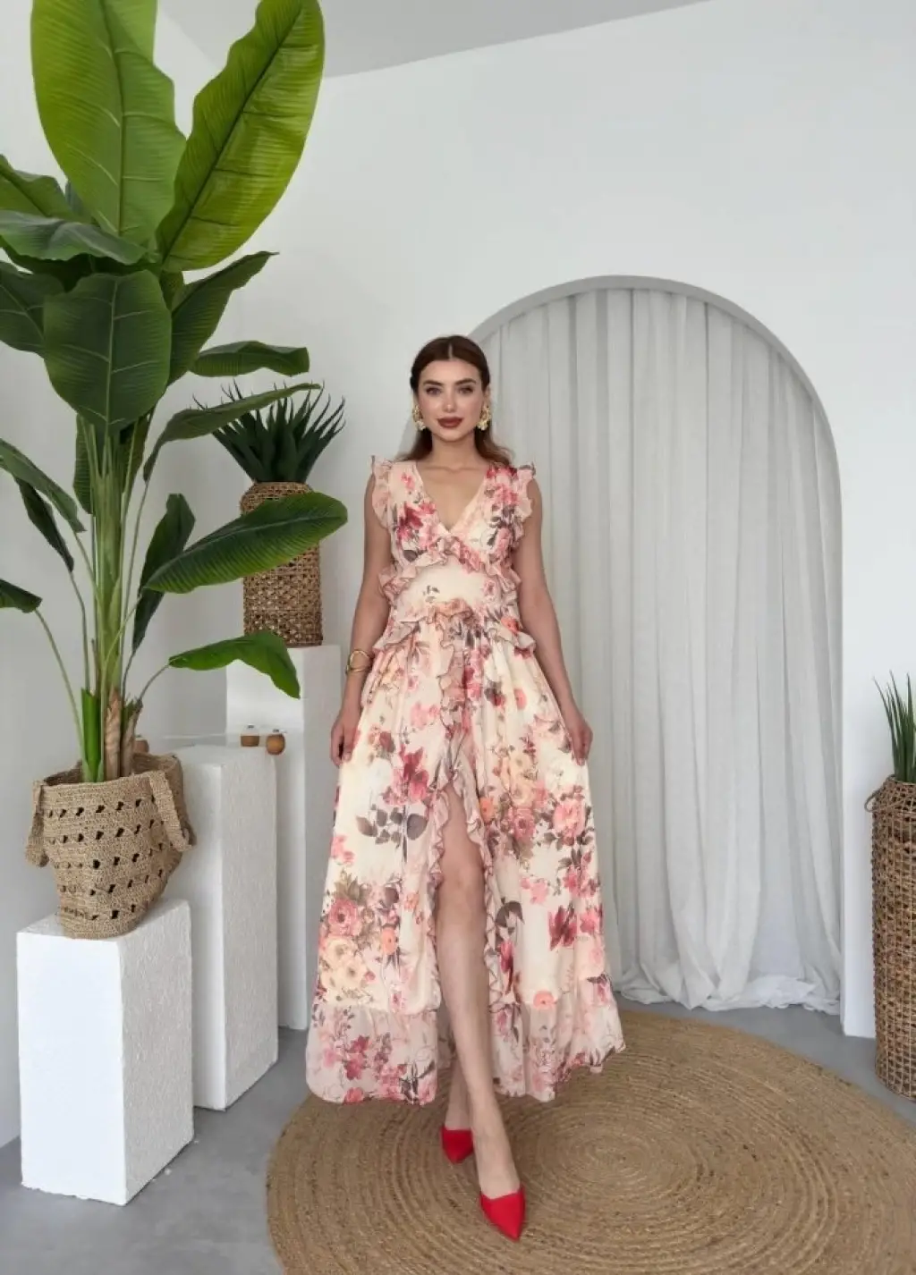 Kadın Askılı Kruvaze Yakalı Fırfırlı Janjan Krep Elbise