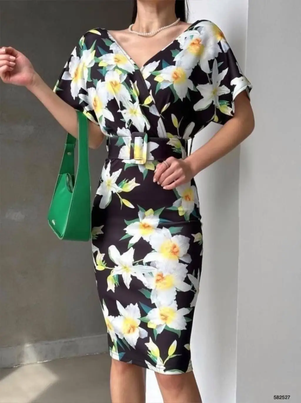 Kadın Dalgıç Kumaş V Yaka çiçek Desenli Kuşaklı Kalem Elbise