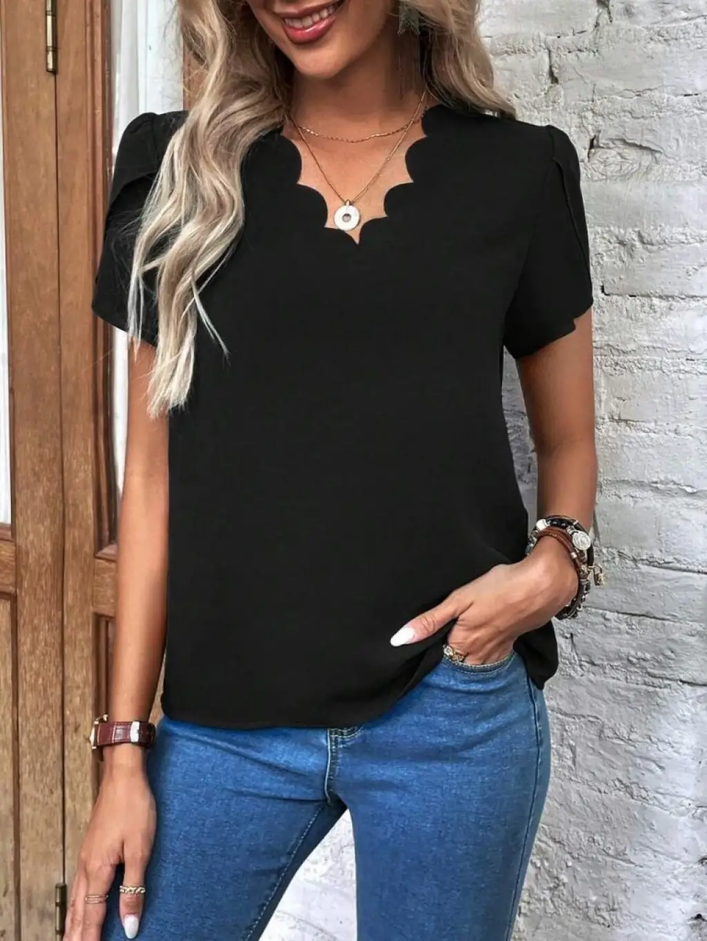 Kadın Kısa Kollu Lazer V Yakalı Ithal Krep Bluz
