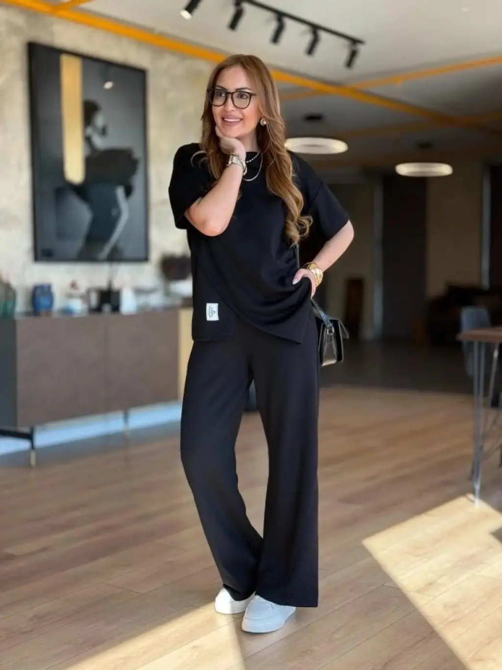 Kadın Kısa Kollu Bisiklet Yaka Asimetrik Viskon Iki Iplik Bluz Ve Pantolon Ikili Takım