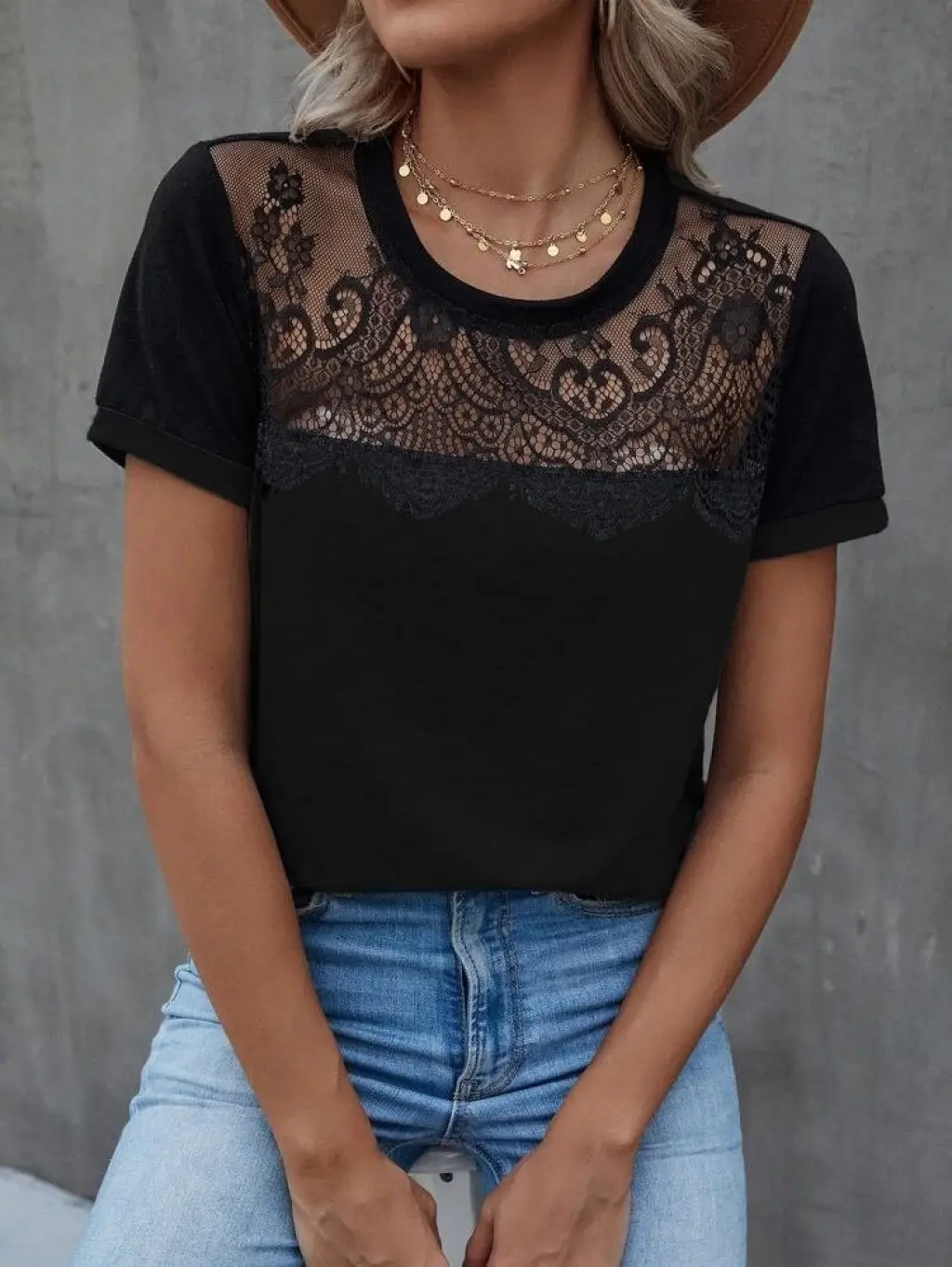 Kadın Kısa Kollu Yuvarlak Yaka ön Dantel Detaylı Viskon Bluz