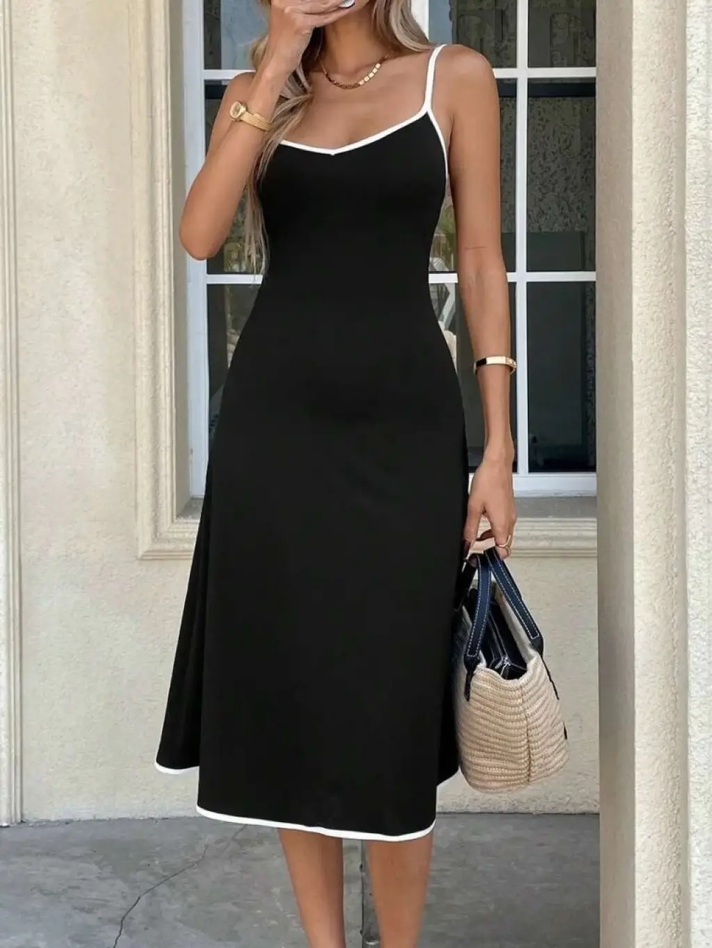 Kadın Ip Askılı Geniş V Yakalı Midi Janjan Krep Elbise