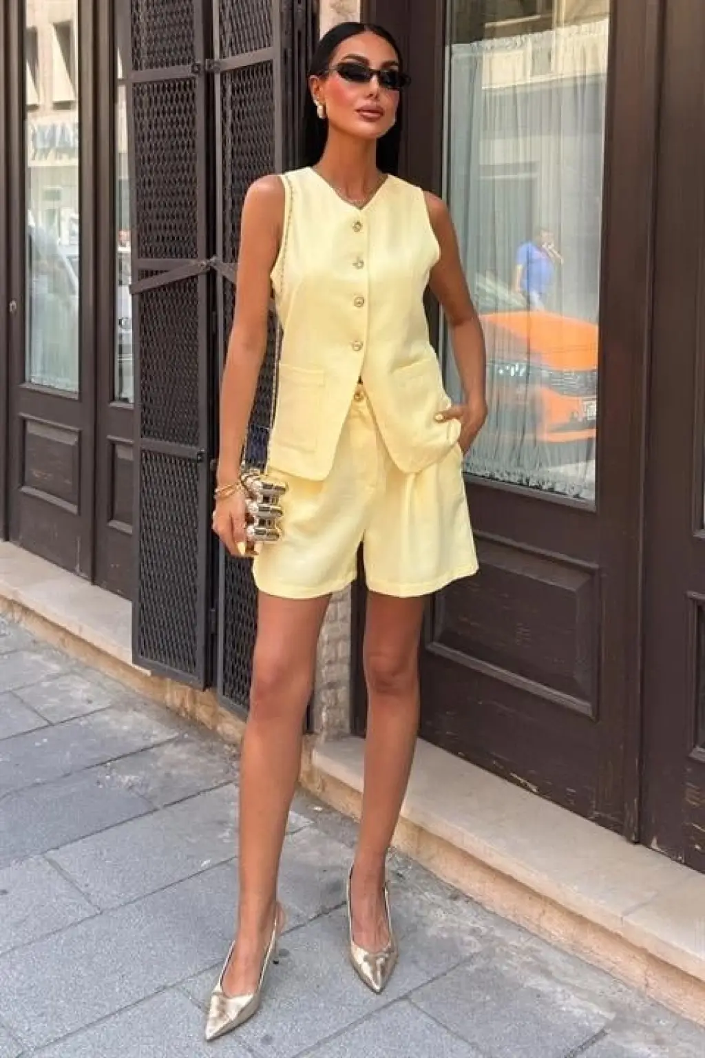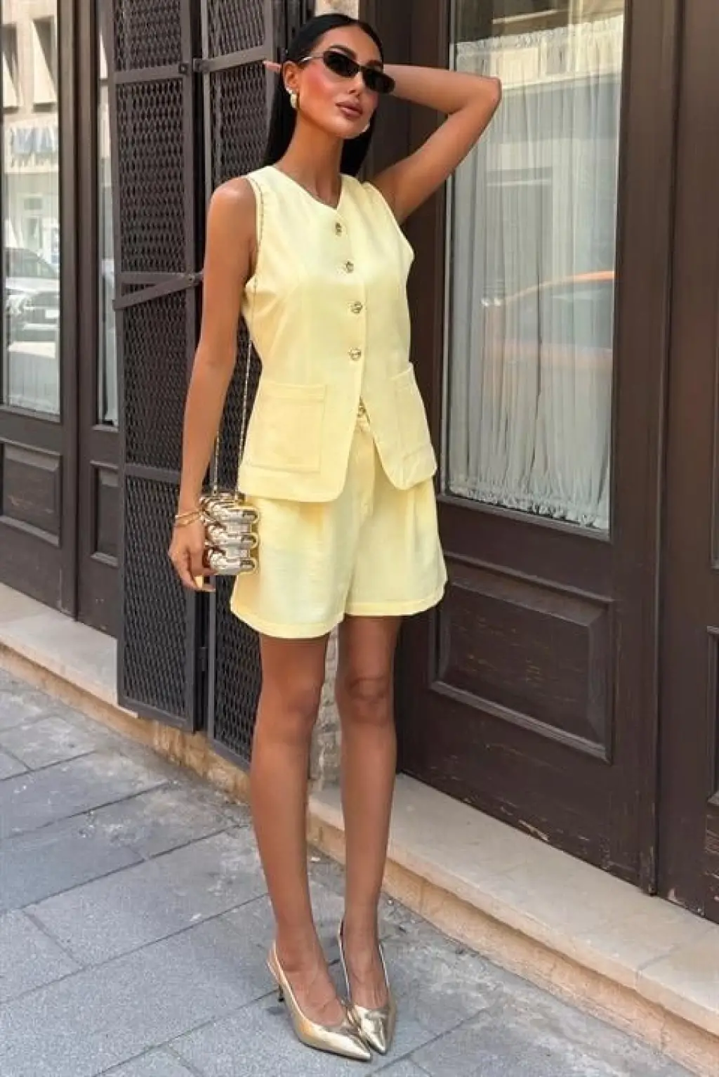 Gold Düğme Detaylı Yelek Şort Cotton Takım 10208