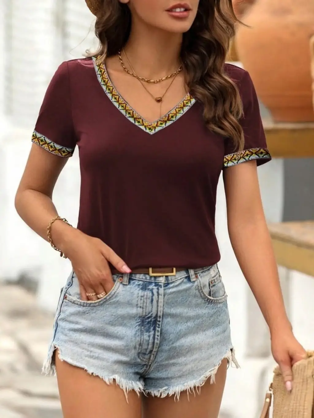 Kadın Kısa Kollu V şerit Etnik Desen Yakalı Viskon Bluz