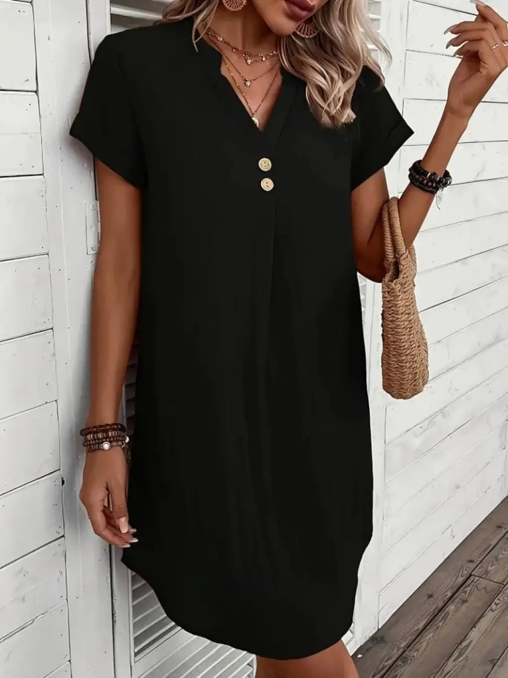 Kadın Kısa Kollu V Yakalı Düğmeli Müslim Kısa Elbise
