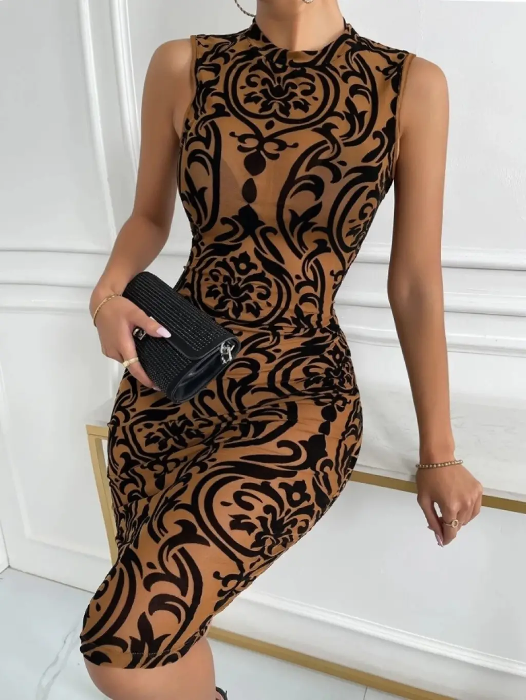 Kadın Kolsuz Yarı Balıkçı Yaka Desenli Dalgıç Elbise