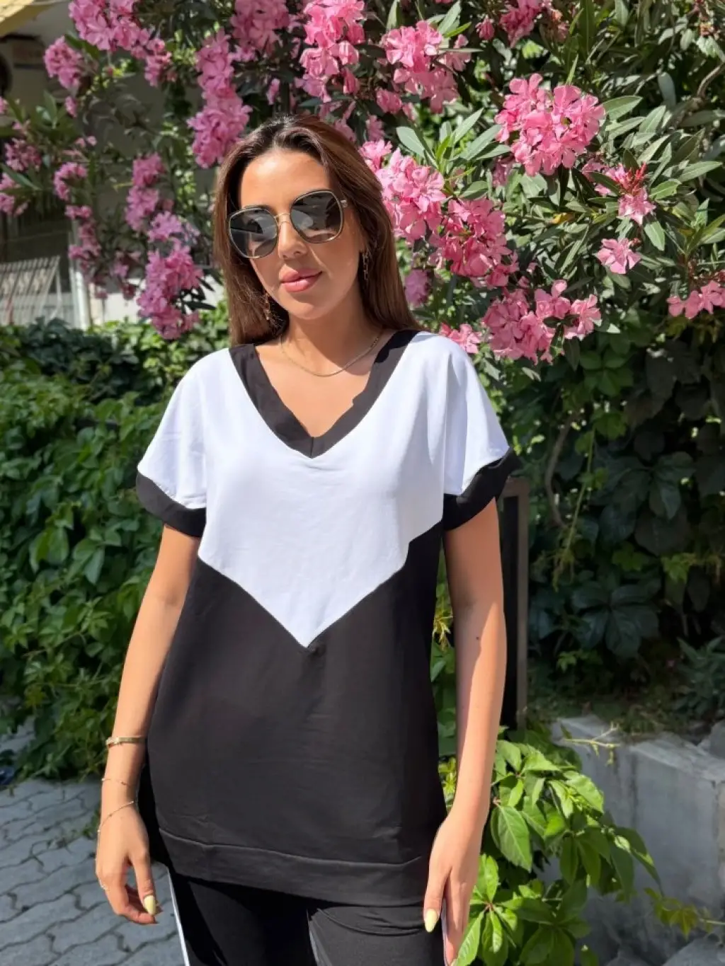 Kadın Kısa Kollu V Yaka Siyah Beyaz Renkli Viskon Iki Iplik Kumaş Eşofman Takımı