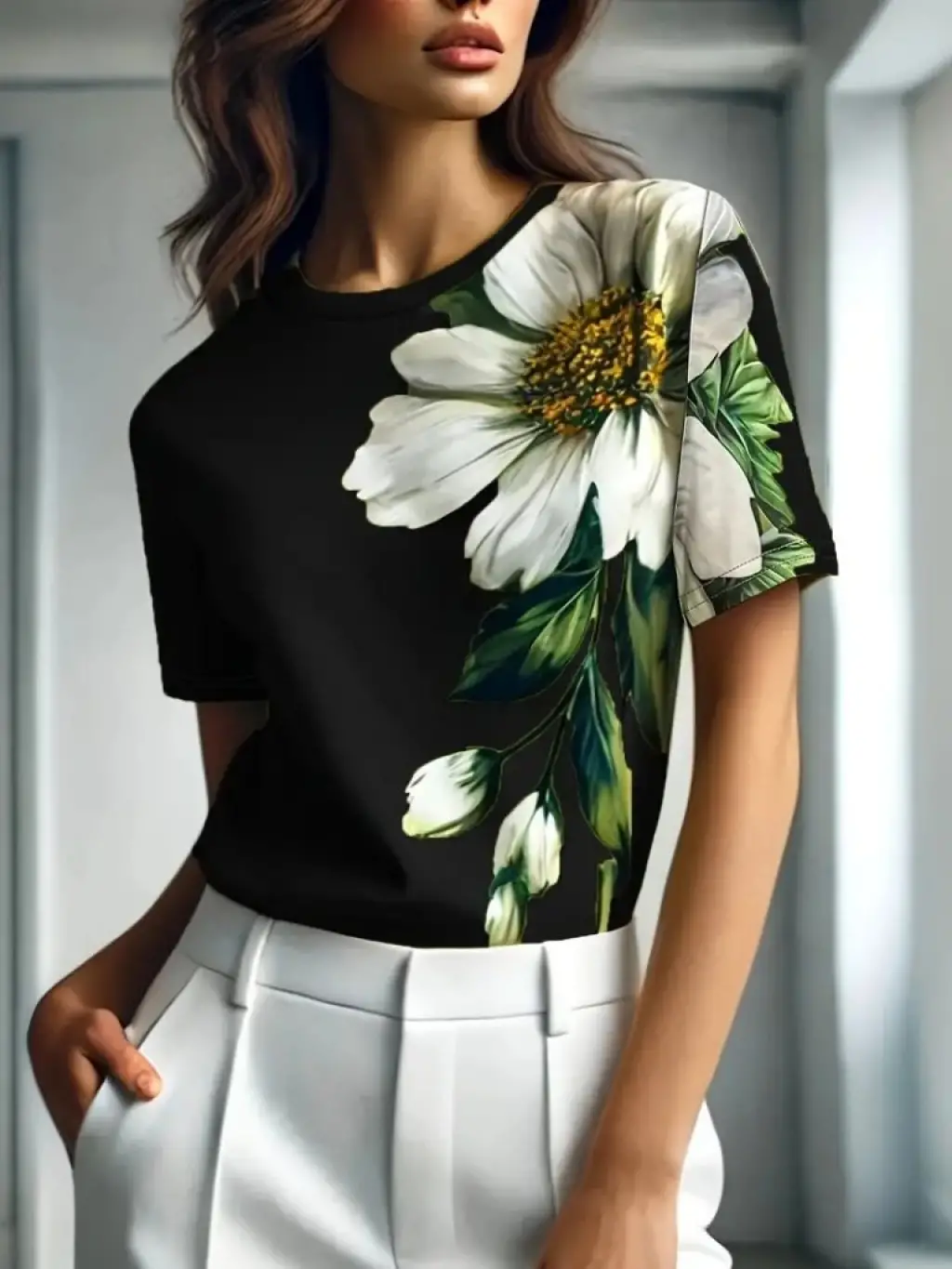 Kadın Kısa Kollu Bisiklet Yaka çiçek Baskılı Süprem Bluz