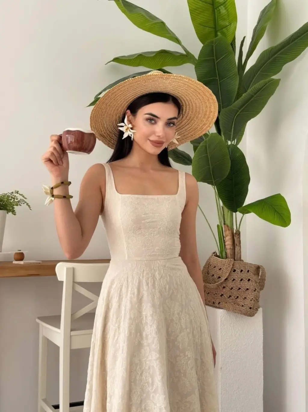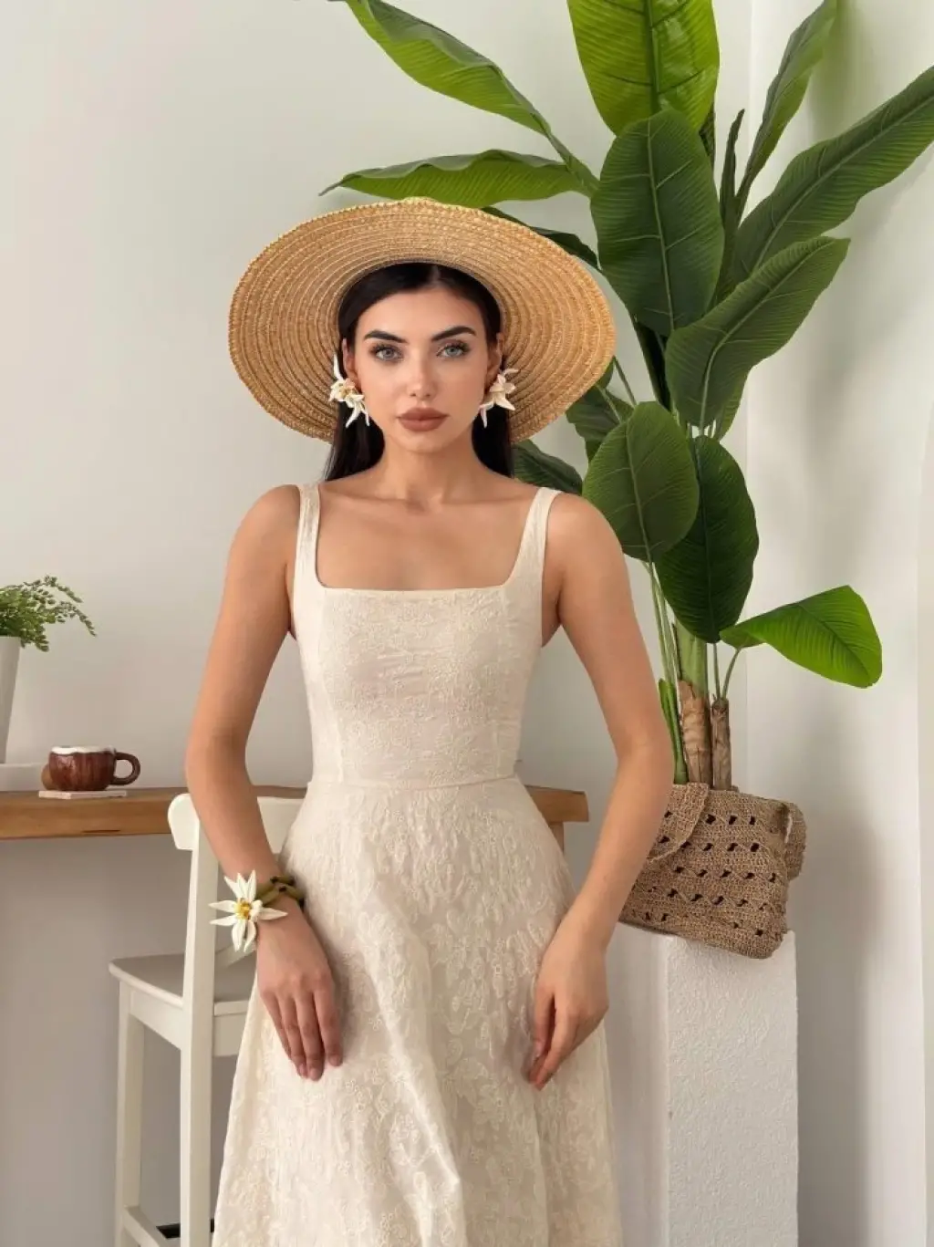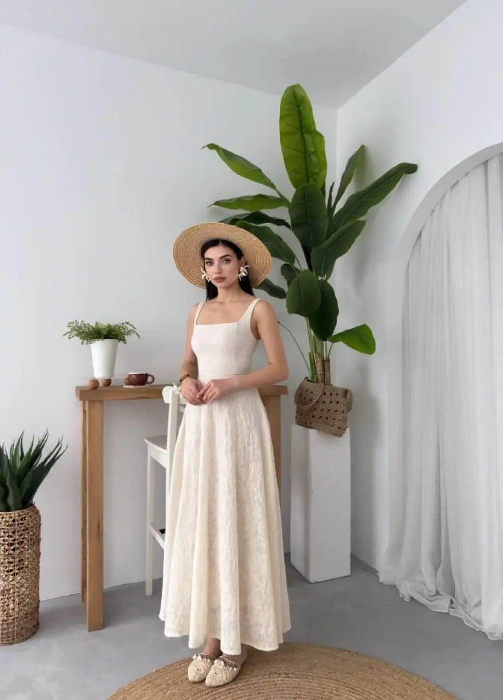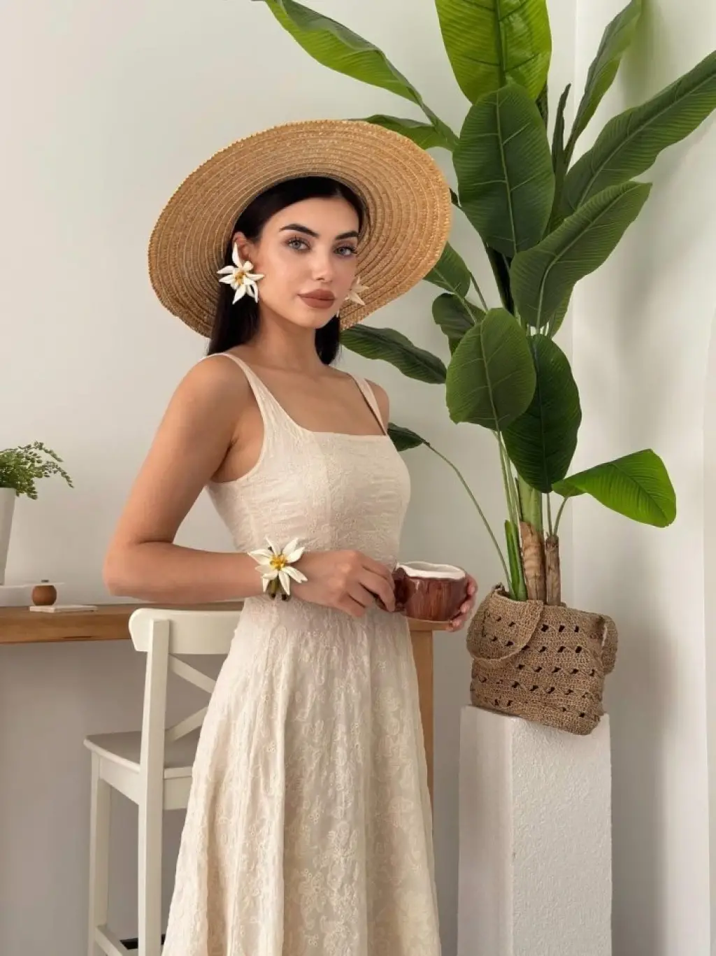 Bej Desenli Ve Önü Düğmeli Keten Elbise