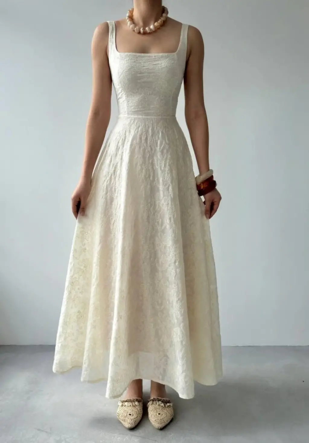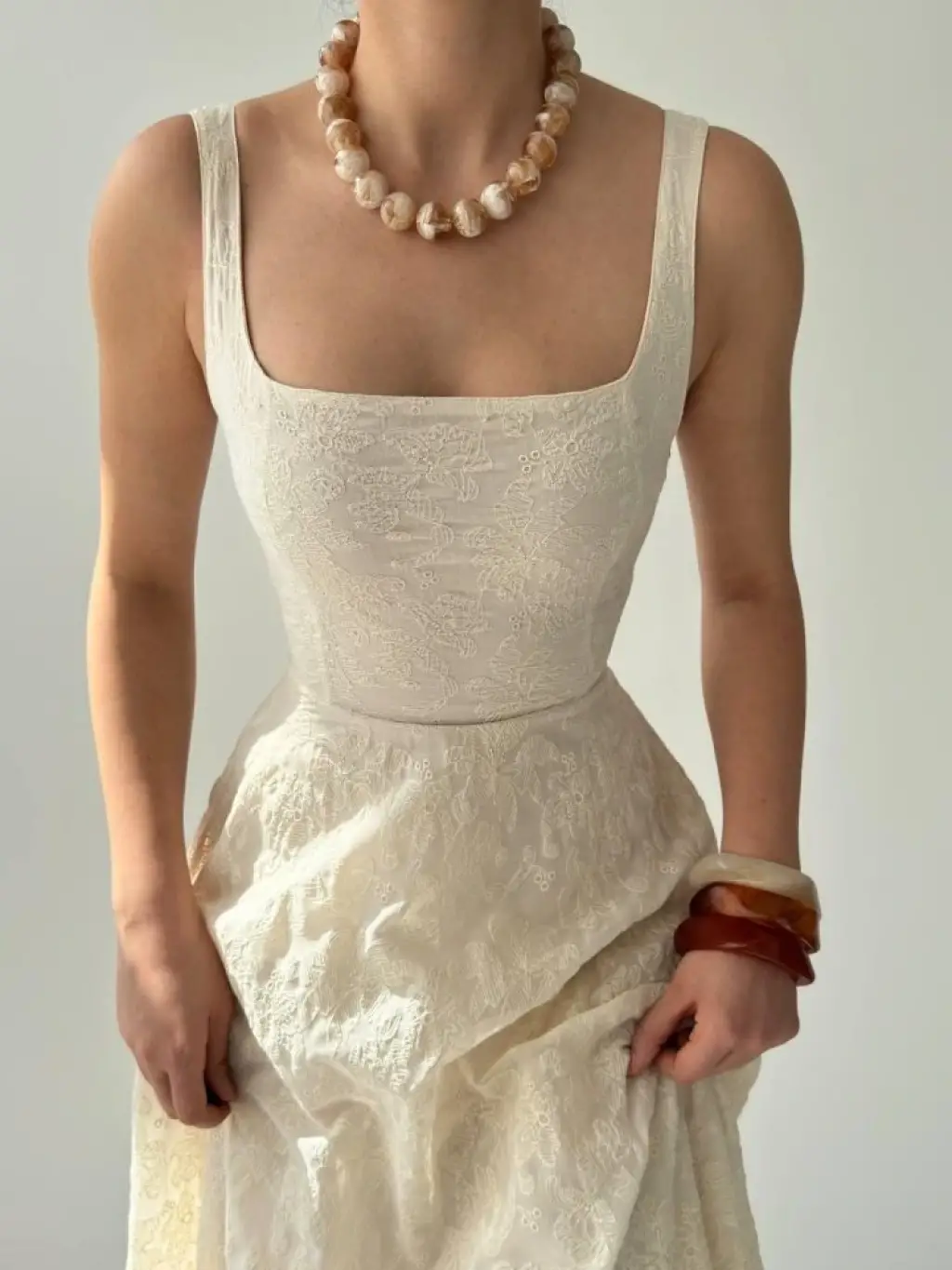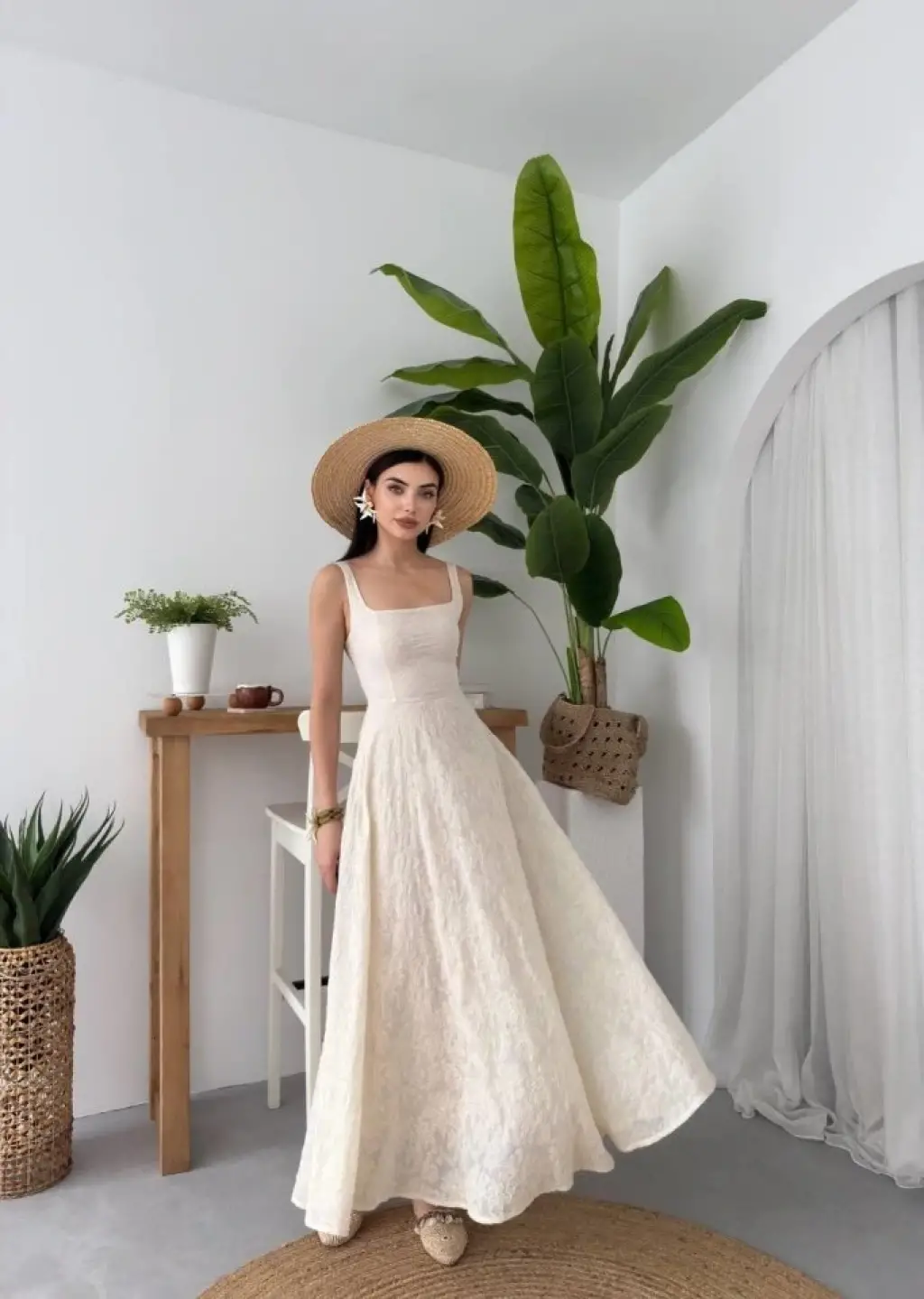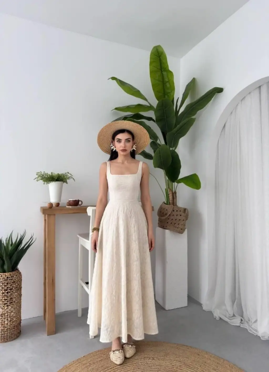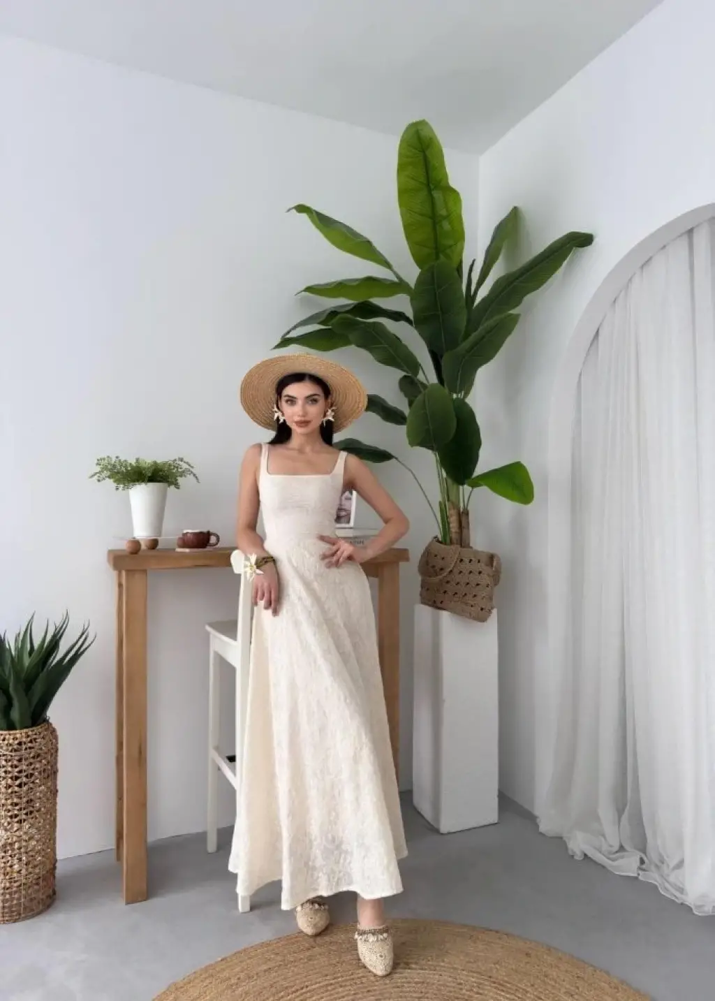 Bej Desenli Ve Önü Düğmeli Keten Elbise