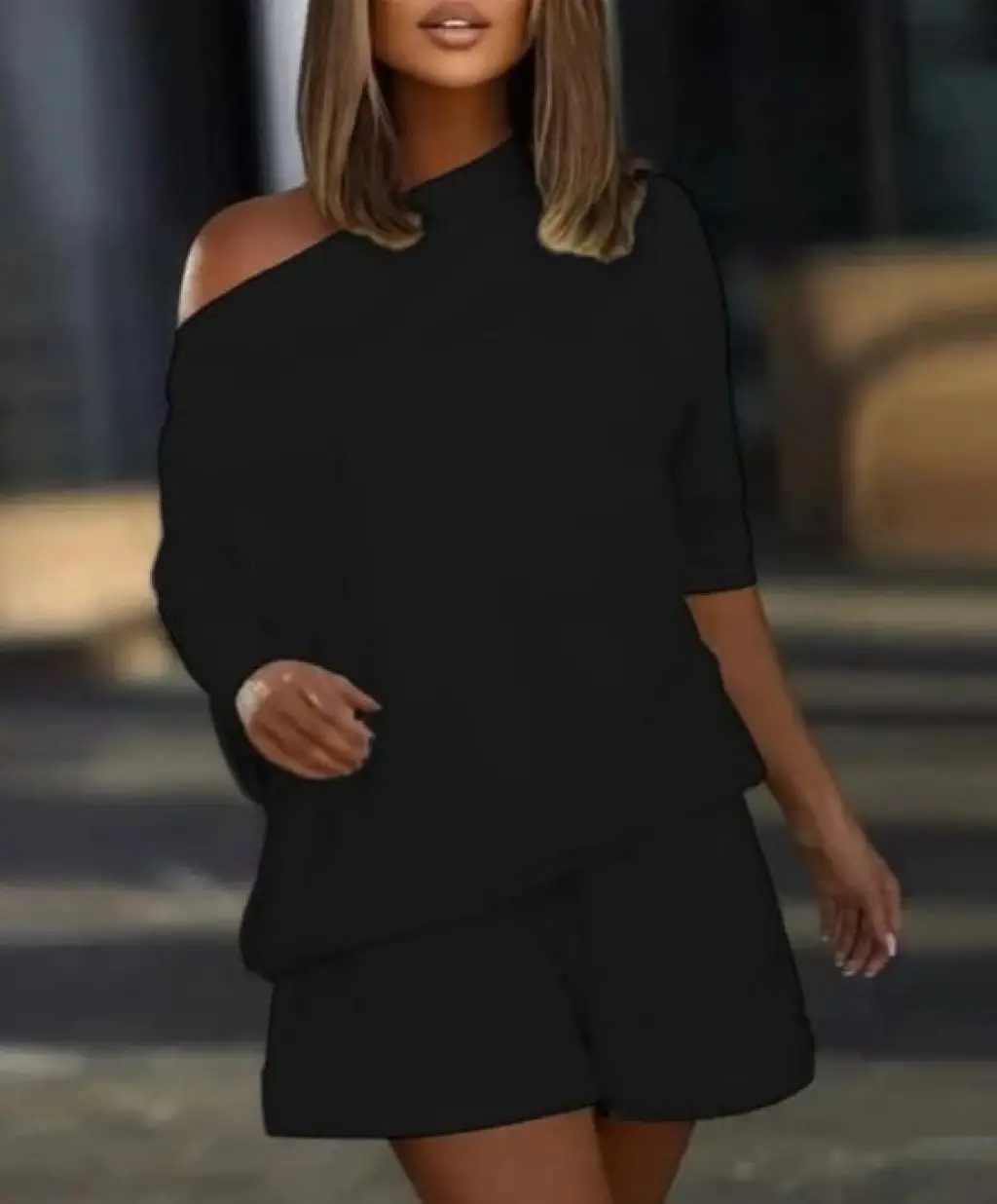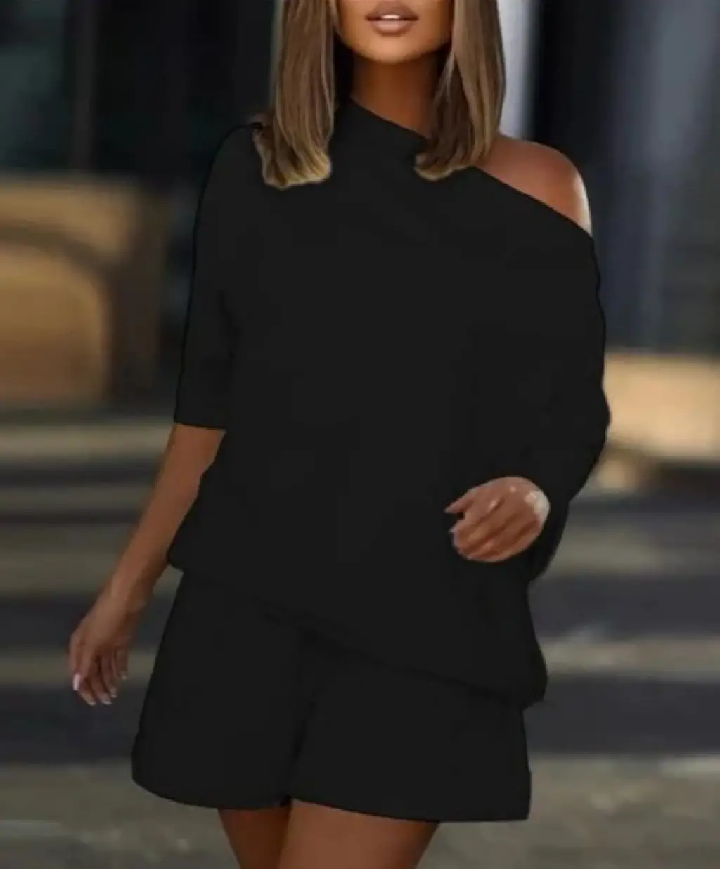 Kadın Kayık Yaka Salaş Iki Iplik Bluz Ve şort Ikili Takım