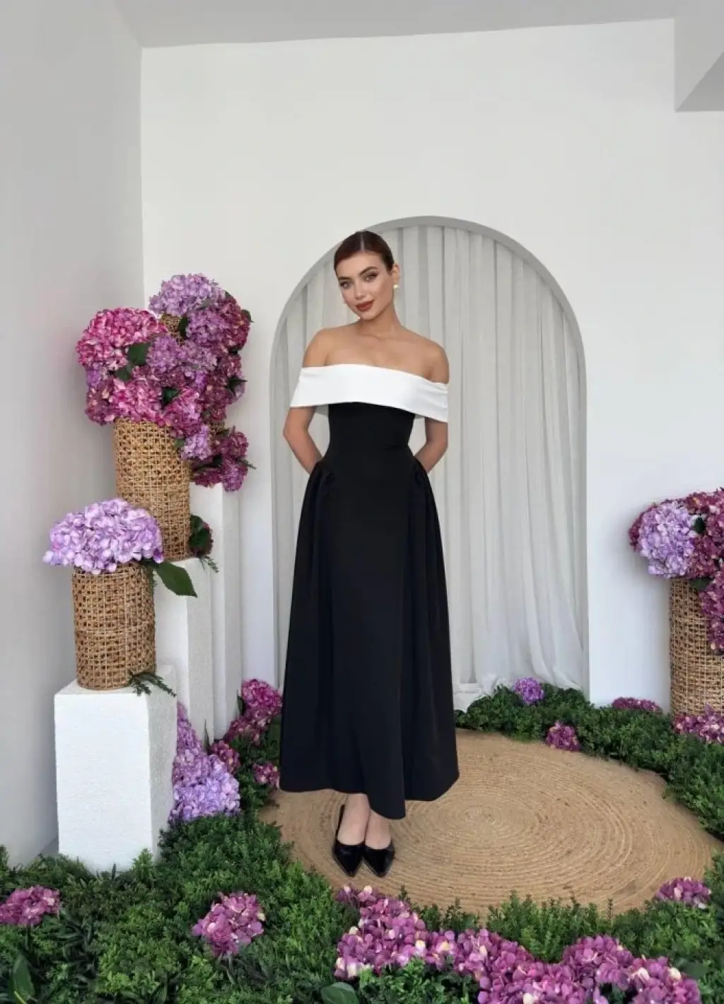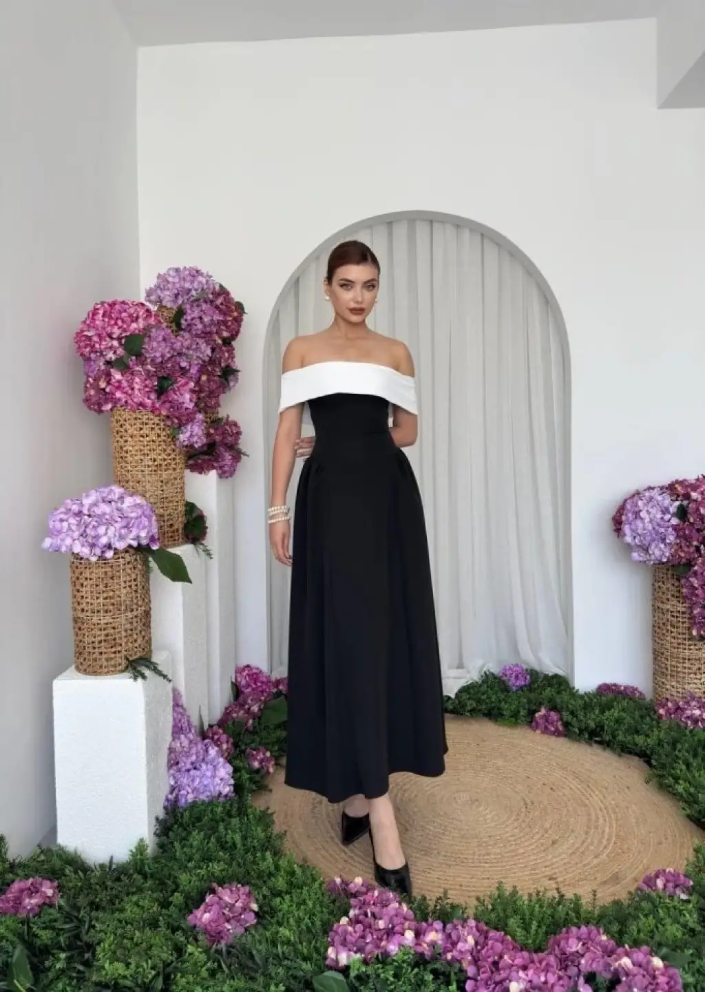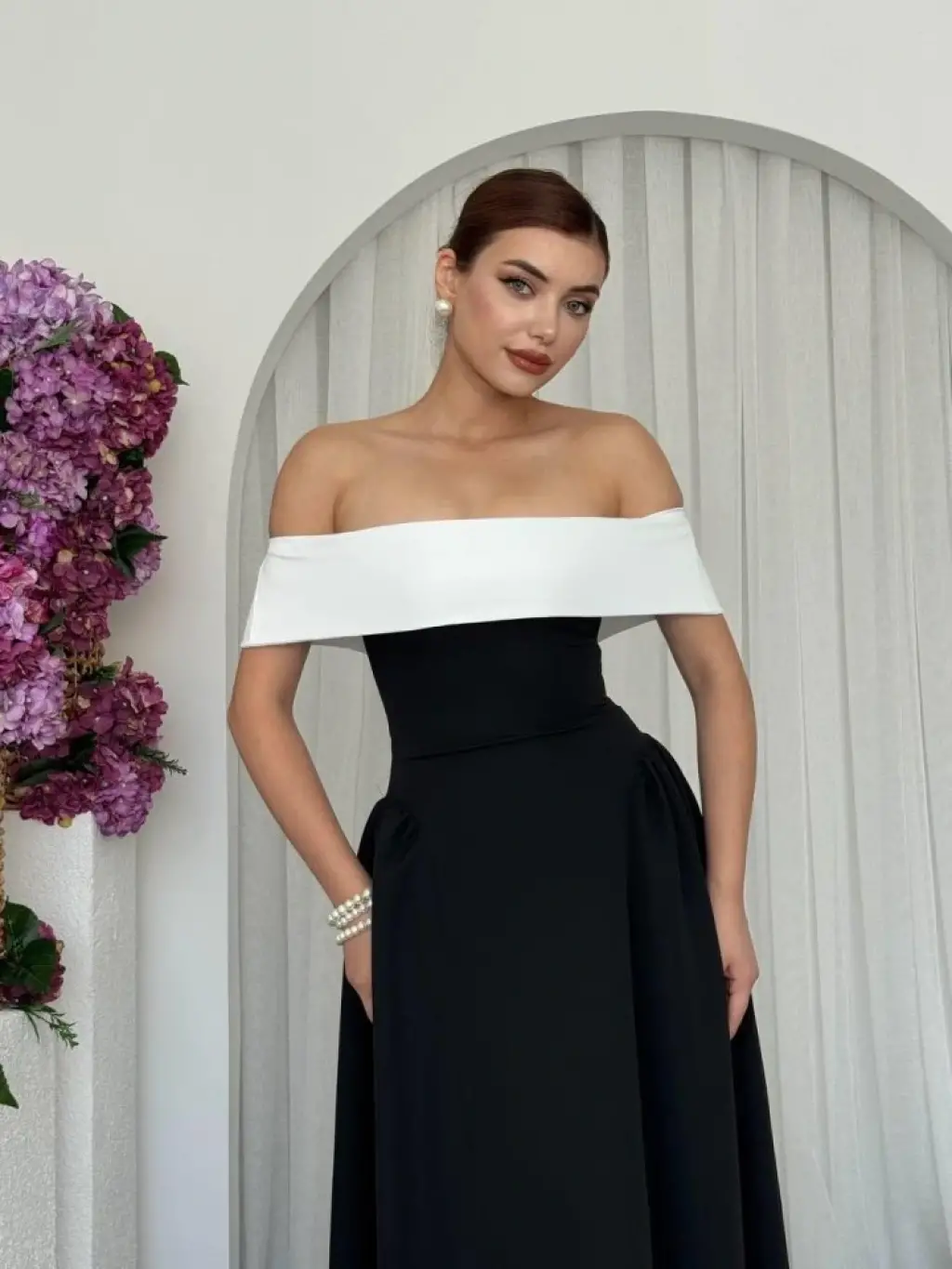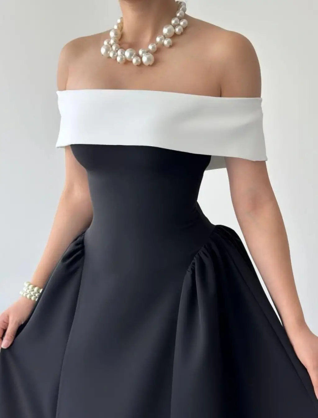 Kadın Kolları Tül Detay Omuz Dekolteli Diz üstü Kalem Elbise