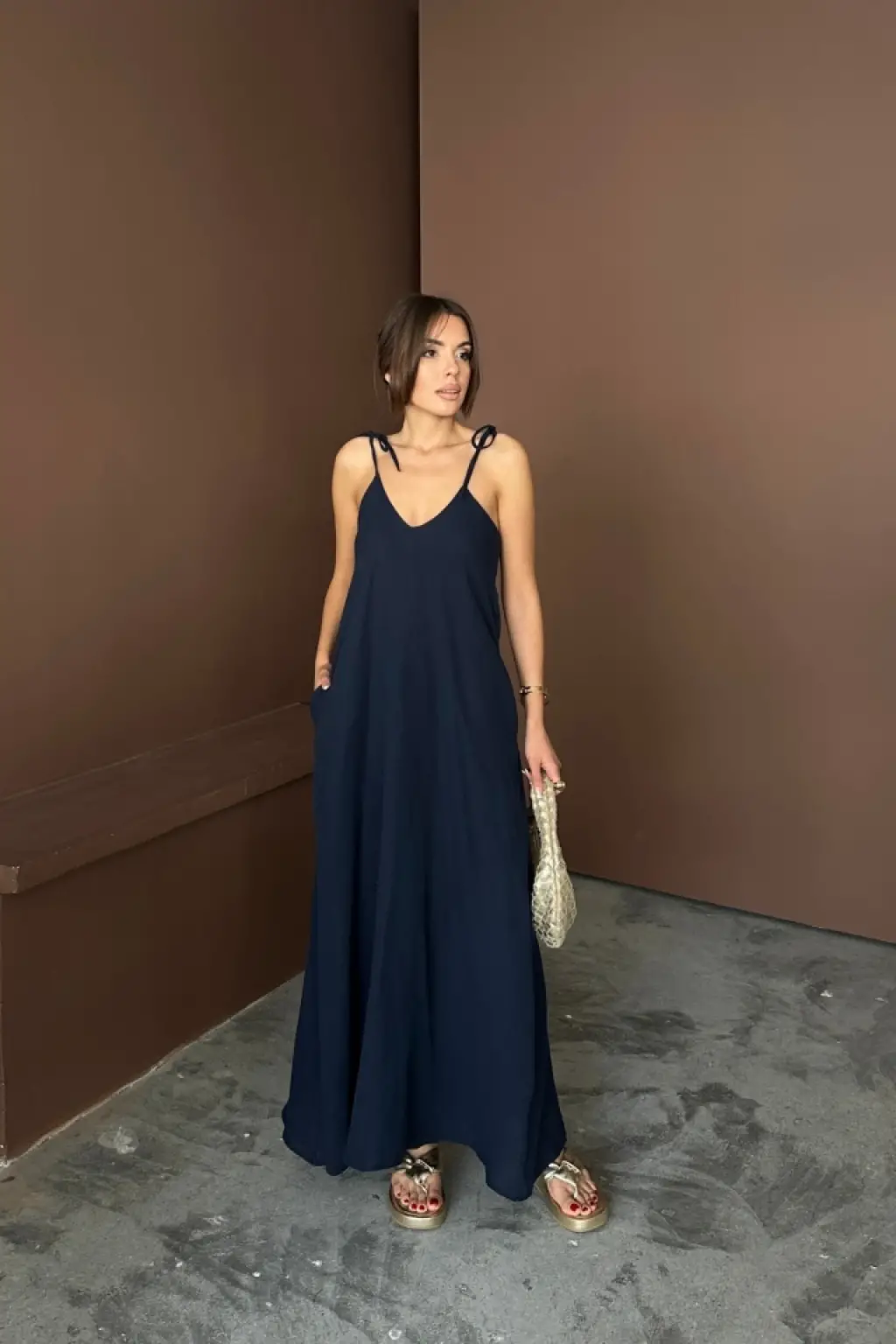 ASKILI UZUN SALAŞ MÜSLİN ELBİSE - Lacivert