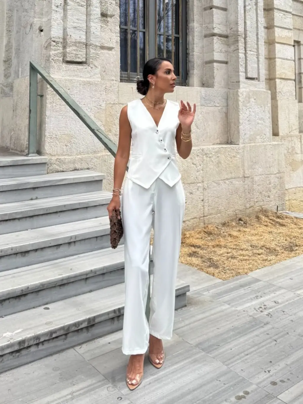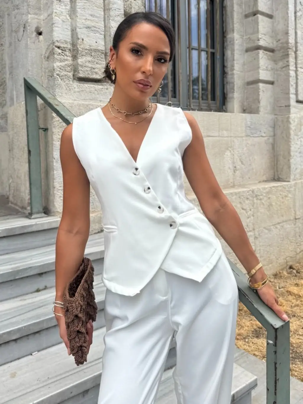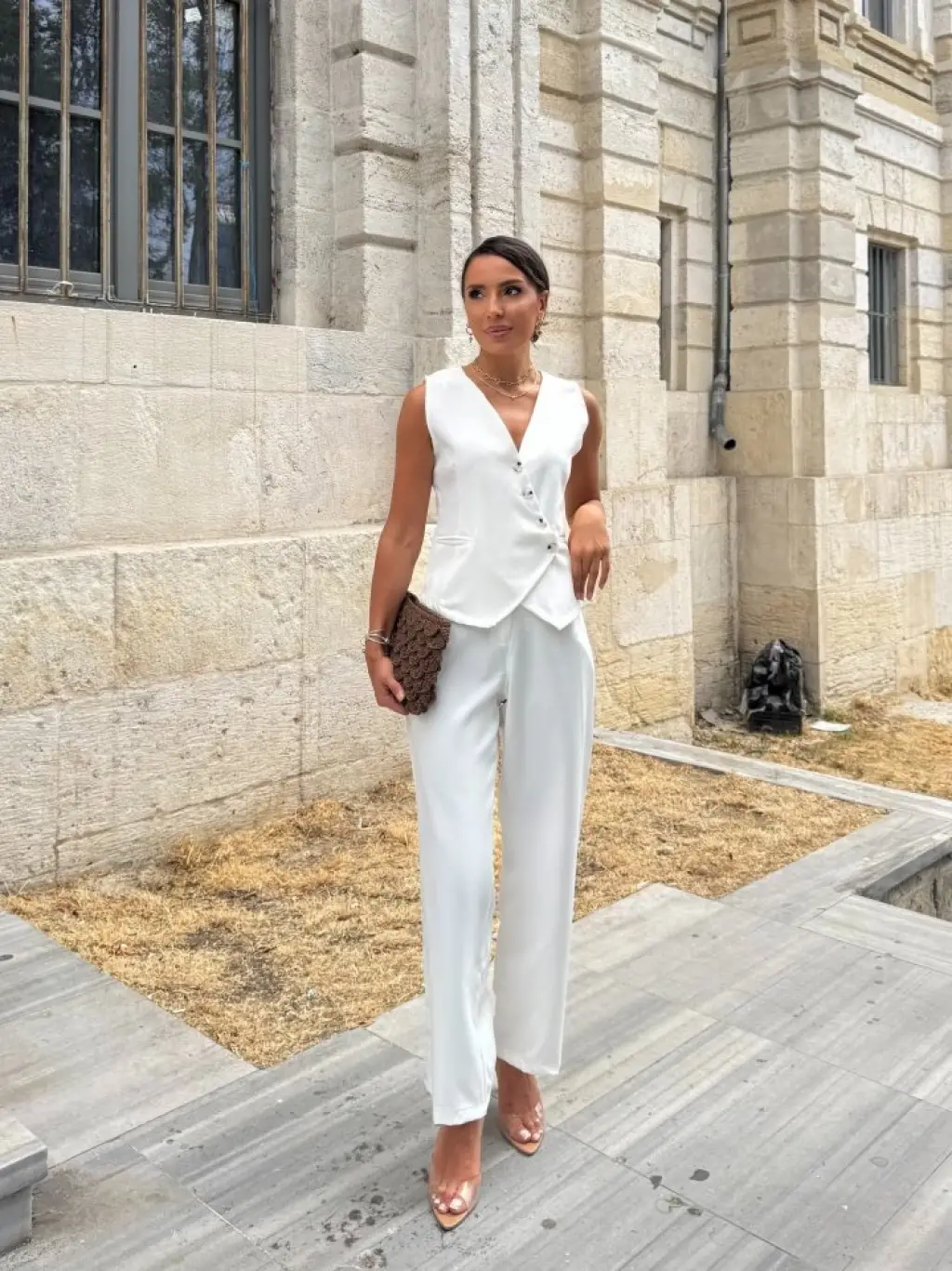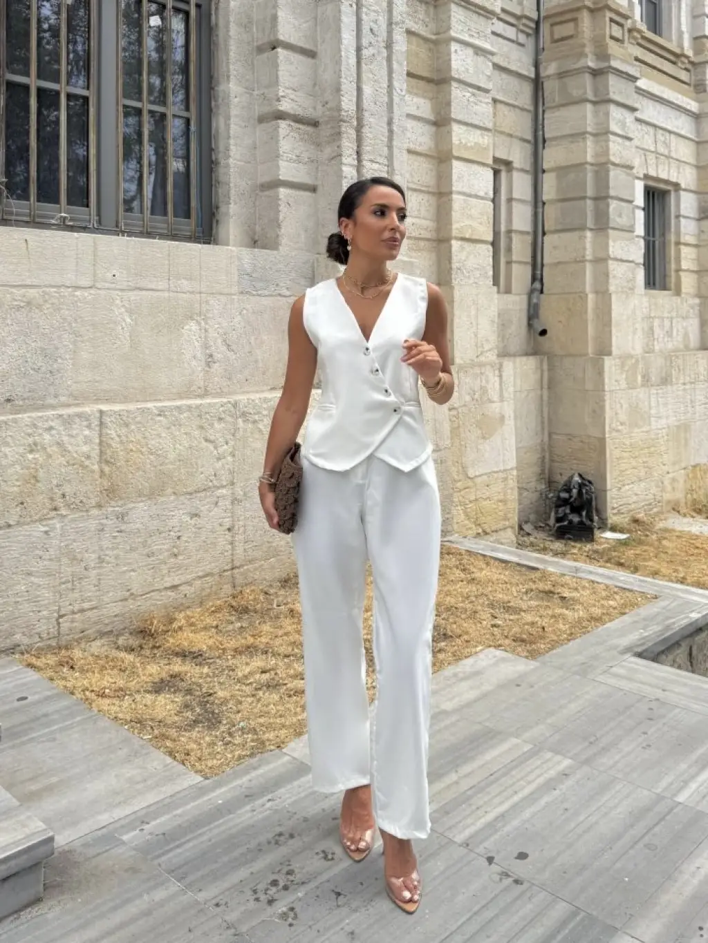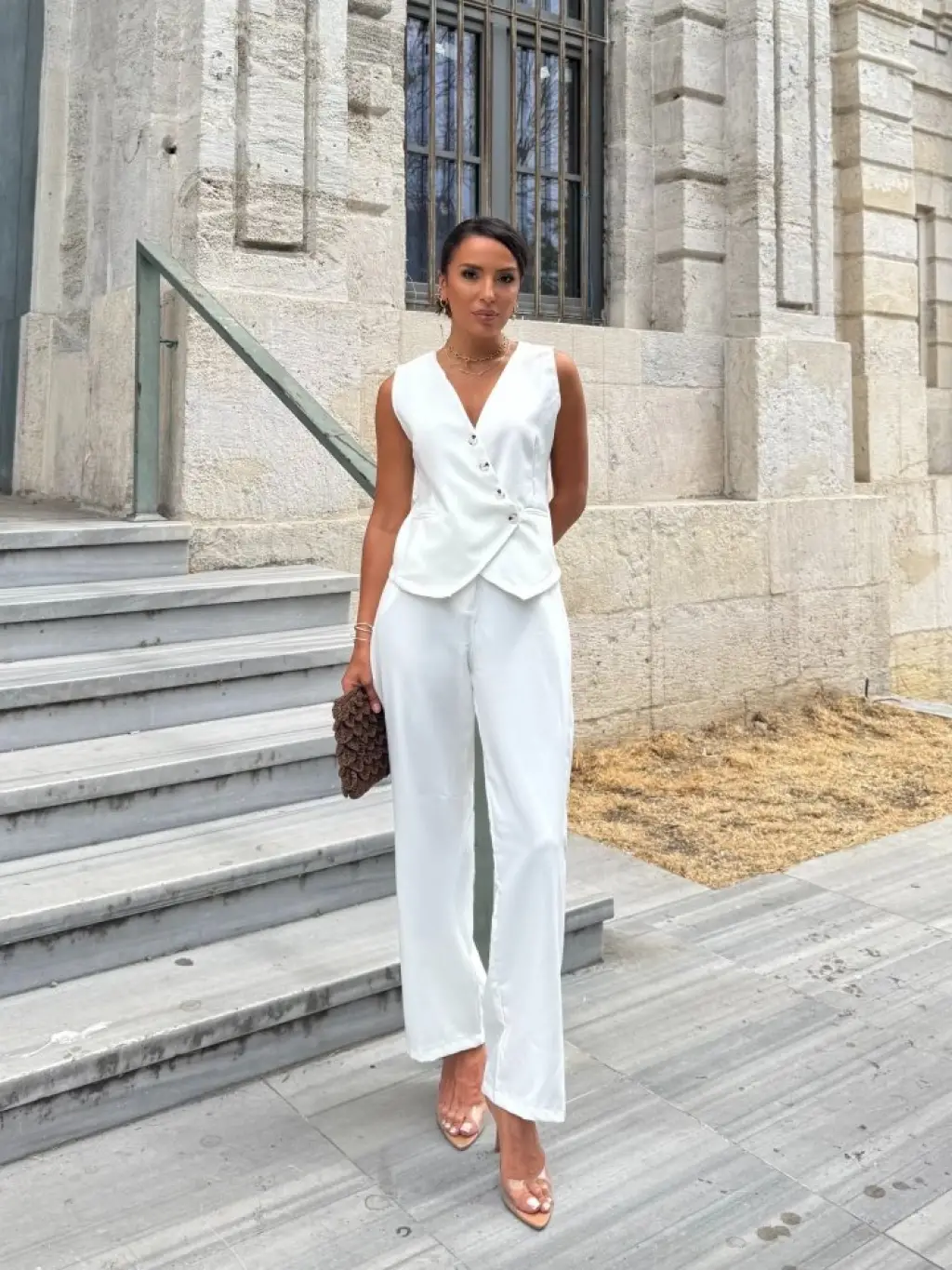 Kadın Sıfır Kollu çapraz V Yakalı önden Düğmeli Atlas Yelek Ve Pantolon Ikili Takım