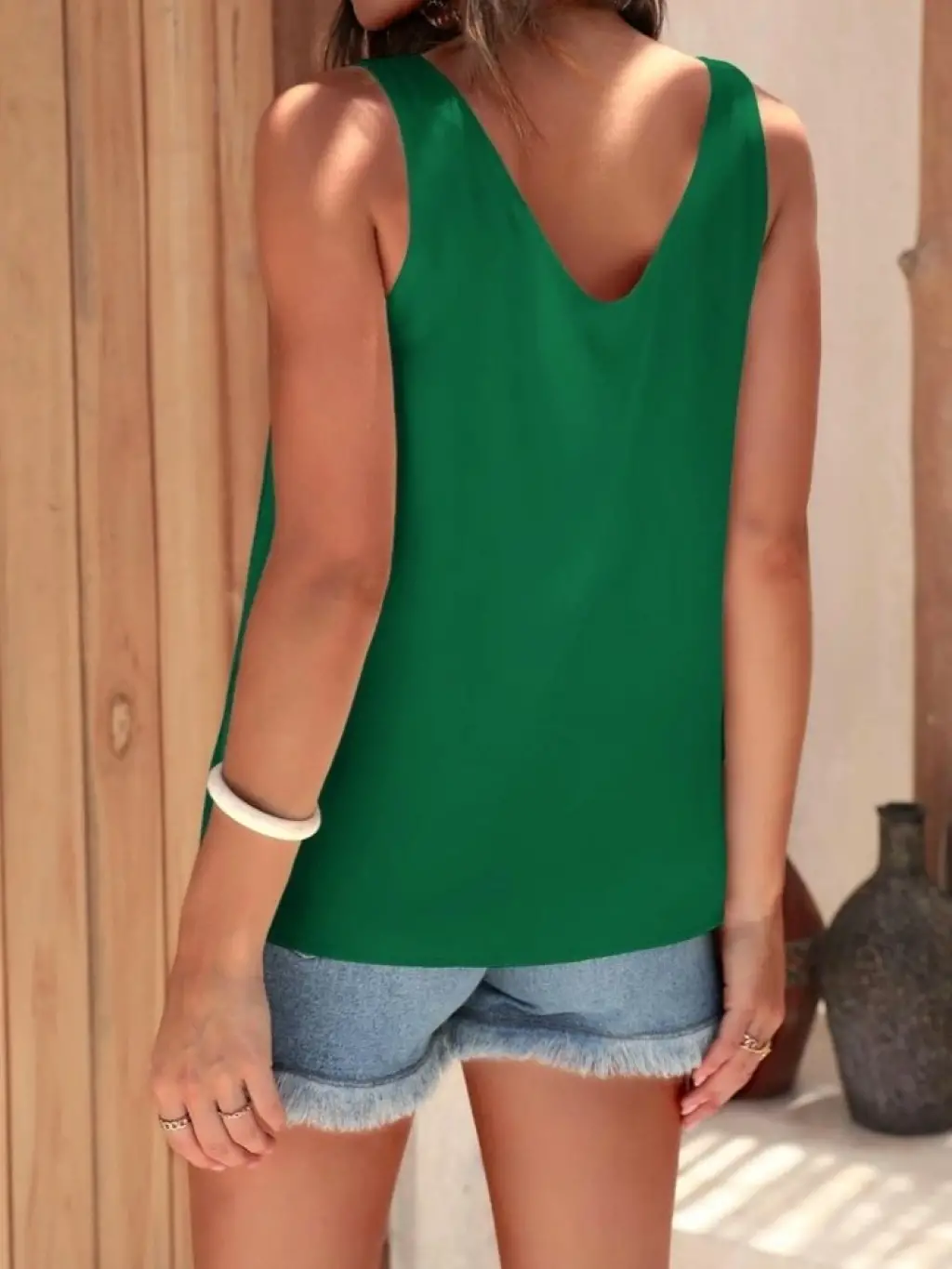 V Yaka Sıfır Kol Saten Bluz-Zümrüt