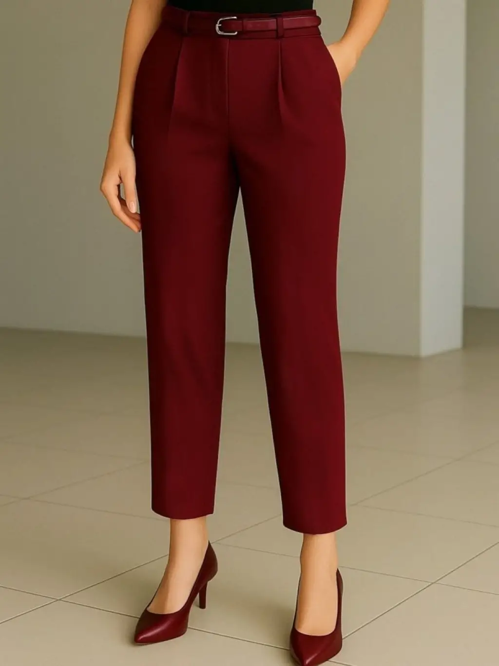 Bordo Renk Yüksek Bel Maskülen Kesim Kumaş Pantolon