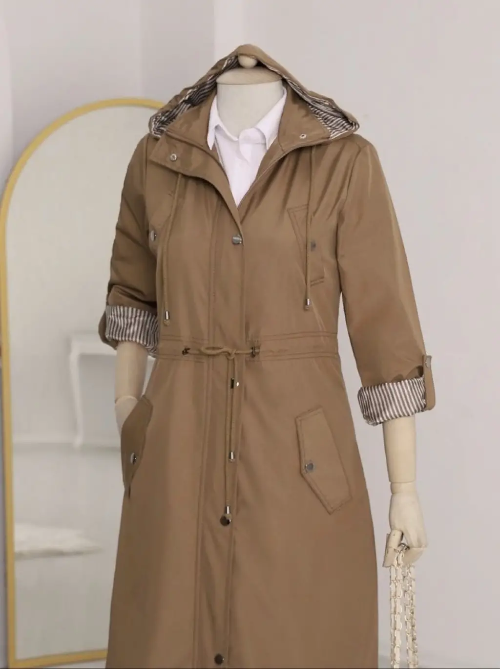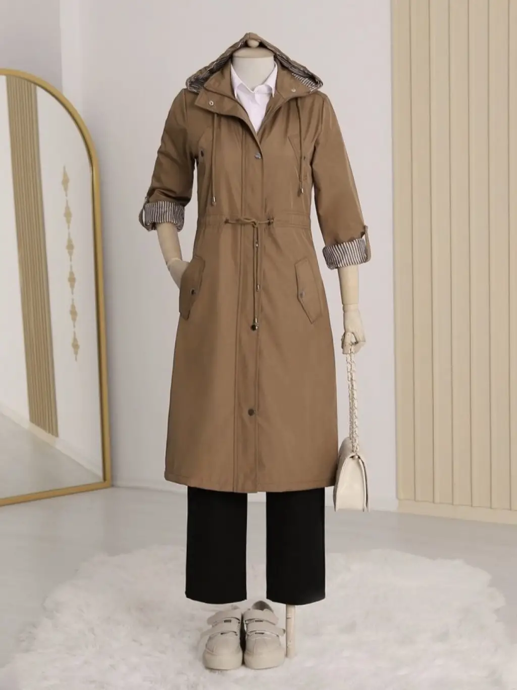 İç Astarlı Düğmeli Kemerli Trençkot -Kahve