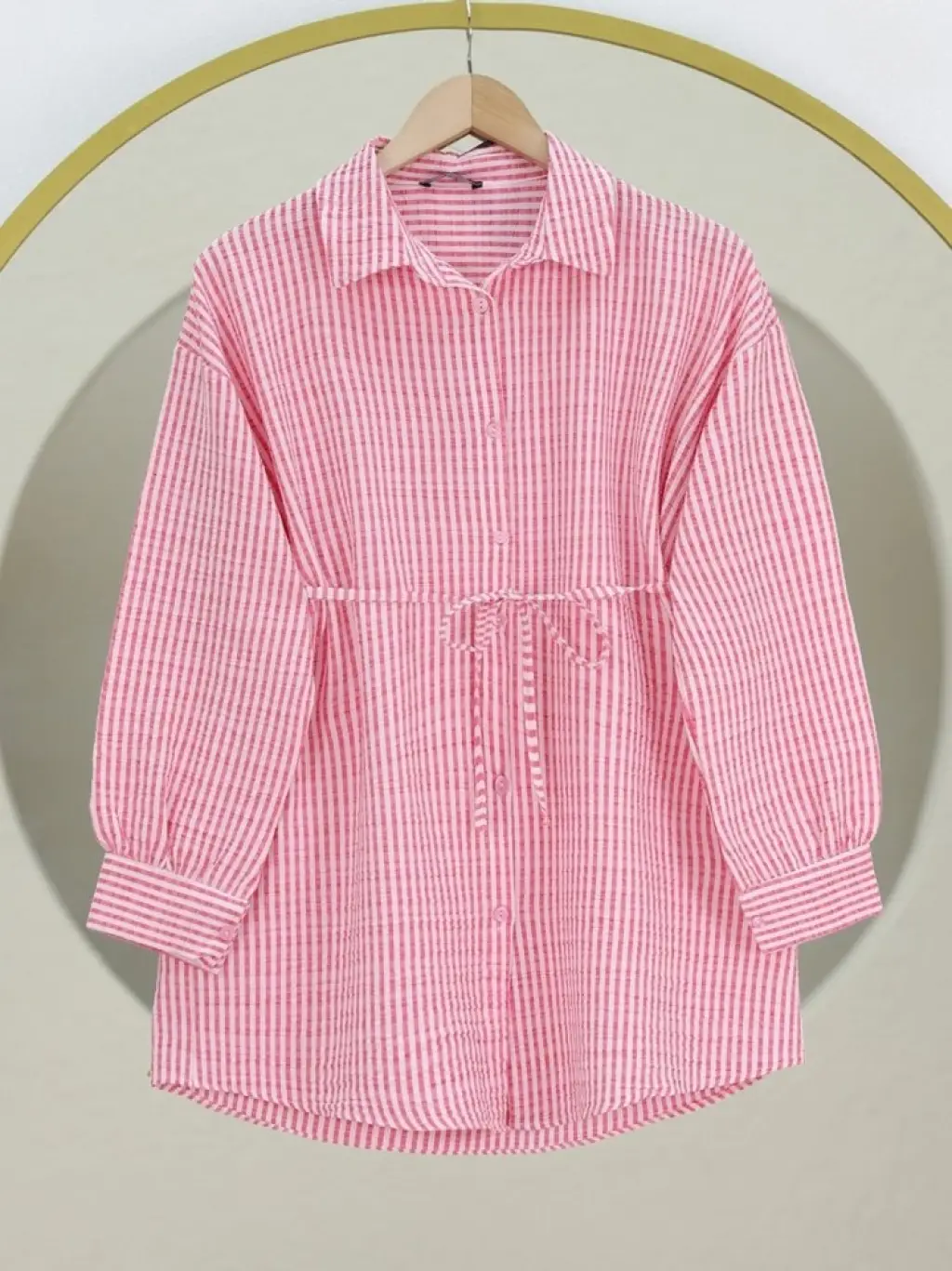 Boydan Düğmeli Bağcıklı Çizgili Bürümcük Gömlek -Pembe